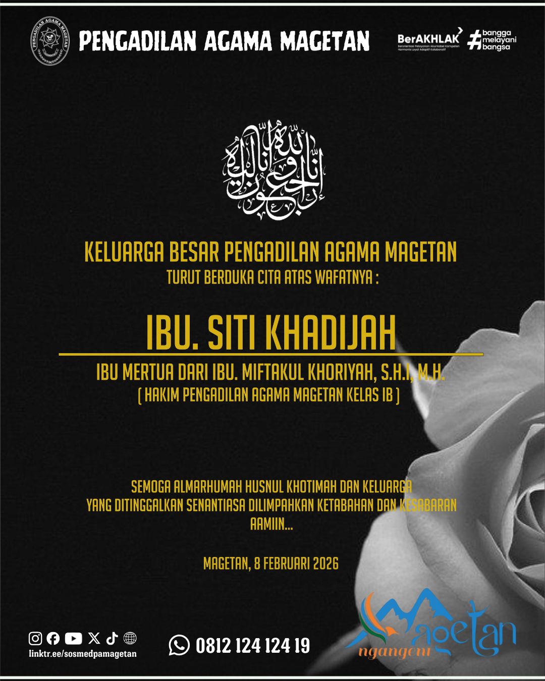 Turut Berduka Cita Atas Wafatnya : Ibu. Siti Khadijah (Ibu Mertua dari Ibu. Miftakul Khoriyah, S.H.I, M.H.) Written by Admin on 09 February 2026. Written by Admin on 09 February 2026. Hits: 39