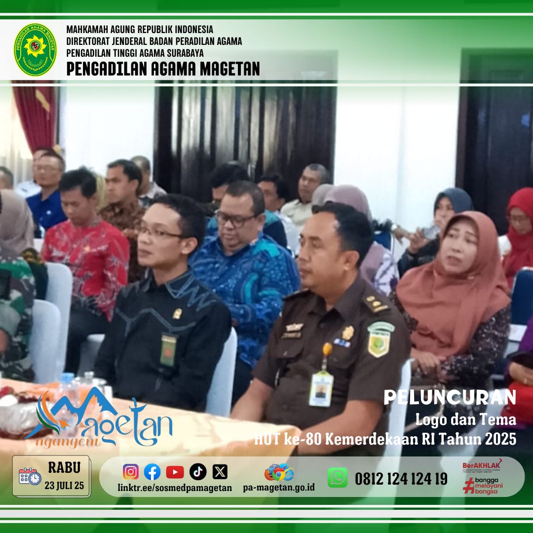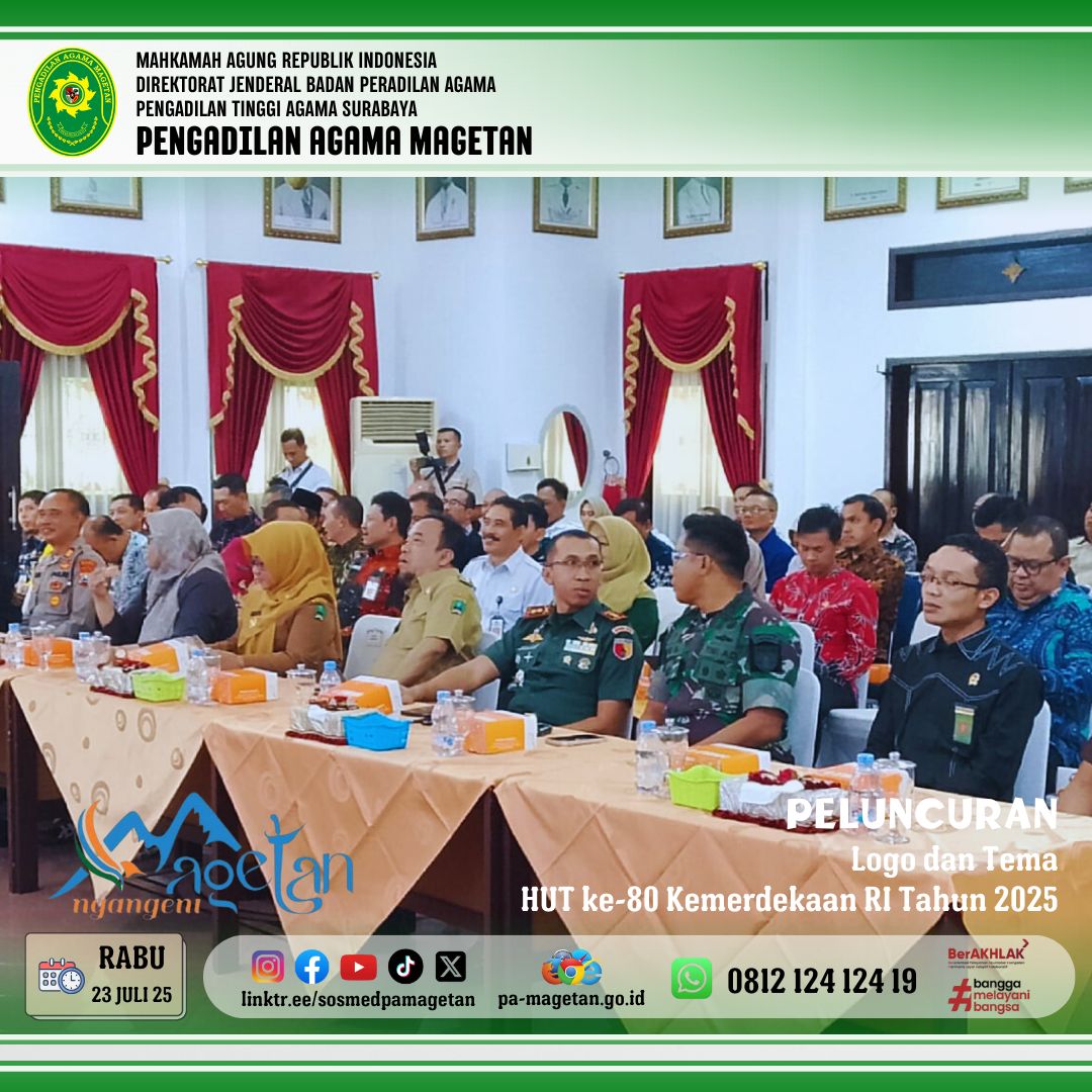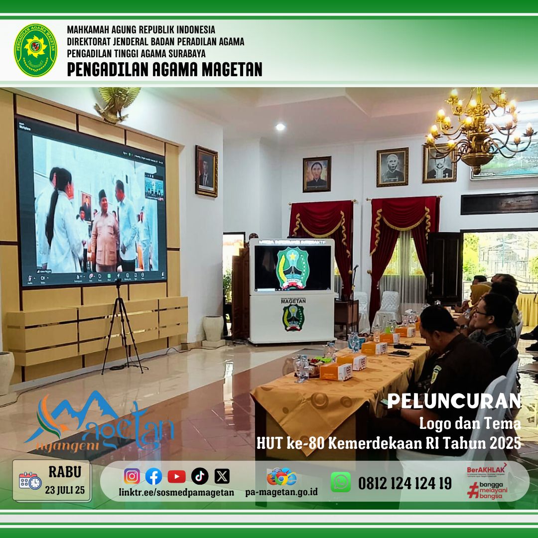 Magetan | pa-magetan.go.id | Pengadilan Agama Magetan Ikuti Peluncuran Logo dan Tema HUT ke-80 Kemerdekaan RI secara Virtual, Rabu, 23 Juli 2025, Kementerian Dalam Negeri Republik Indonesia mengadakan peluncuran logo dan tema Hari Ulang Tahun (HUT) ke-80 Kemerdekaan Republik Indonesia. Acara ini dilaksanakan secara virtual dan diikuti oleh seluruh kepala daerah beserta instansi pemerintah, termasuk Pengadilan Agama Magetan. Kegiatan ini dimulai pukul 16.00 WIB dan berlangsung hingga selesai dengan dihadiri para pejabat daerah. Pengadilan Agama Magetan diwakili oleh Bapak Muhamad Azka Rafiyullah Muhtarom, S.Sy. yang mengikuti jalannya acara di Pendopo Surya Graha Magetan.