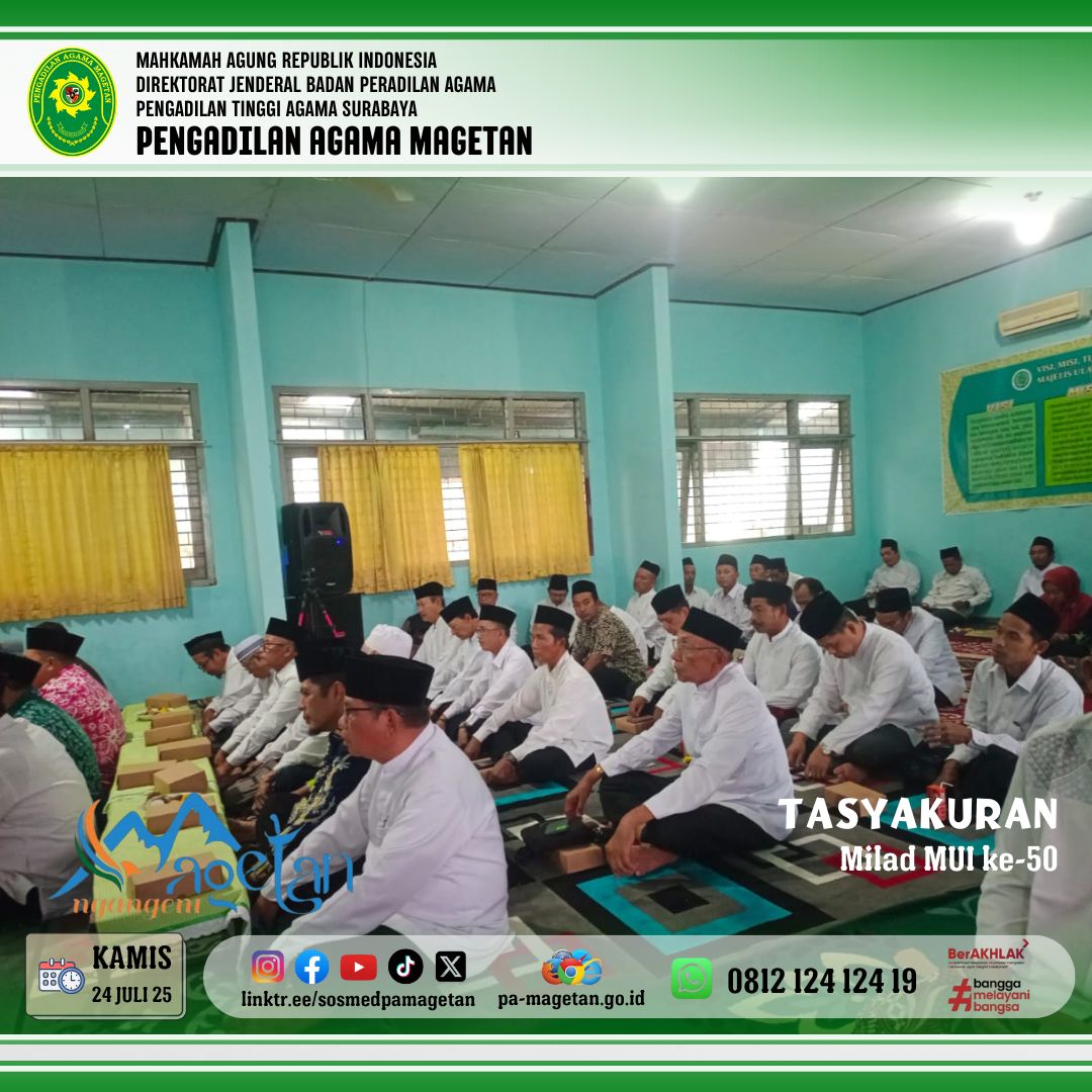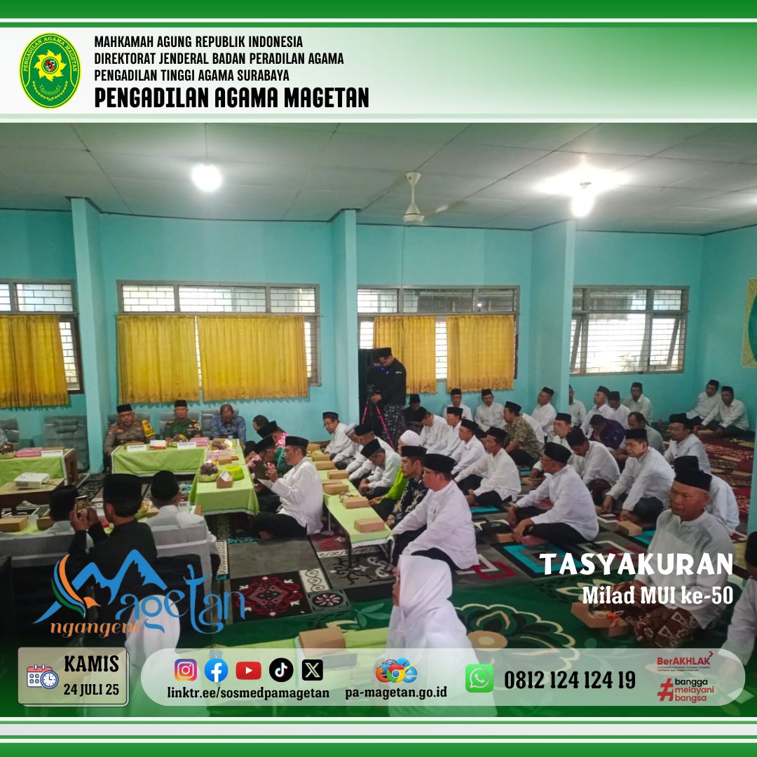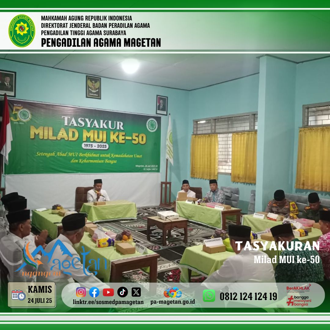 Magetan | pa-magetan.go.id Pada kamis, 24 Juli 2025 pukul 09.30 WIB,Bertempat di Kantor MUI Kabupaten Magetan, Jl. Karya Dharma No.18 Magetan, telah dilaksanakan kegiatan Tasyakuran Milad MUI ke-50. Turut hadir dalam kegiatan tersebut para pimpinan Forum Komunikasi Pimpinan Daerah (Forkopimda) Kabupaten Magetan dari berbagai instansi. Pengadilan Agama Magetan diwakili oleh Dr. Sugeng, M.H. Suasana penuh kekhidmatan menyertai rangkaian acara yang digelar sebagai bentuk rasa syukur atas perjalanan panjang MUI.