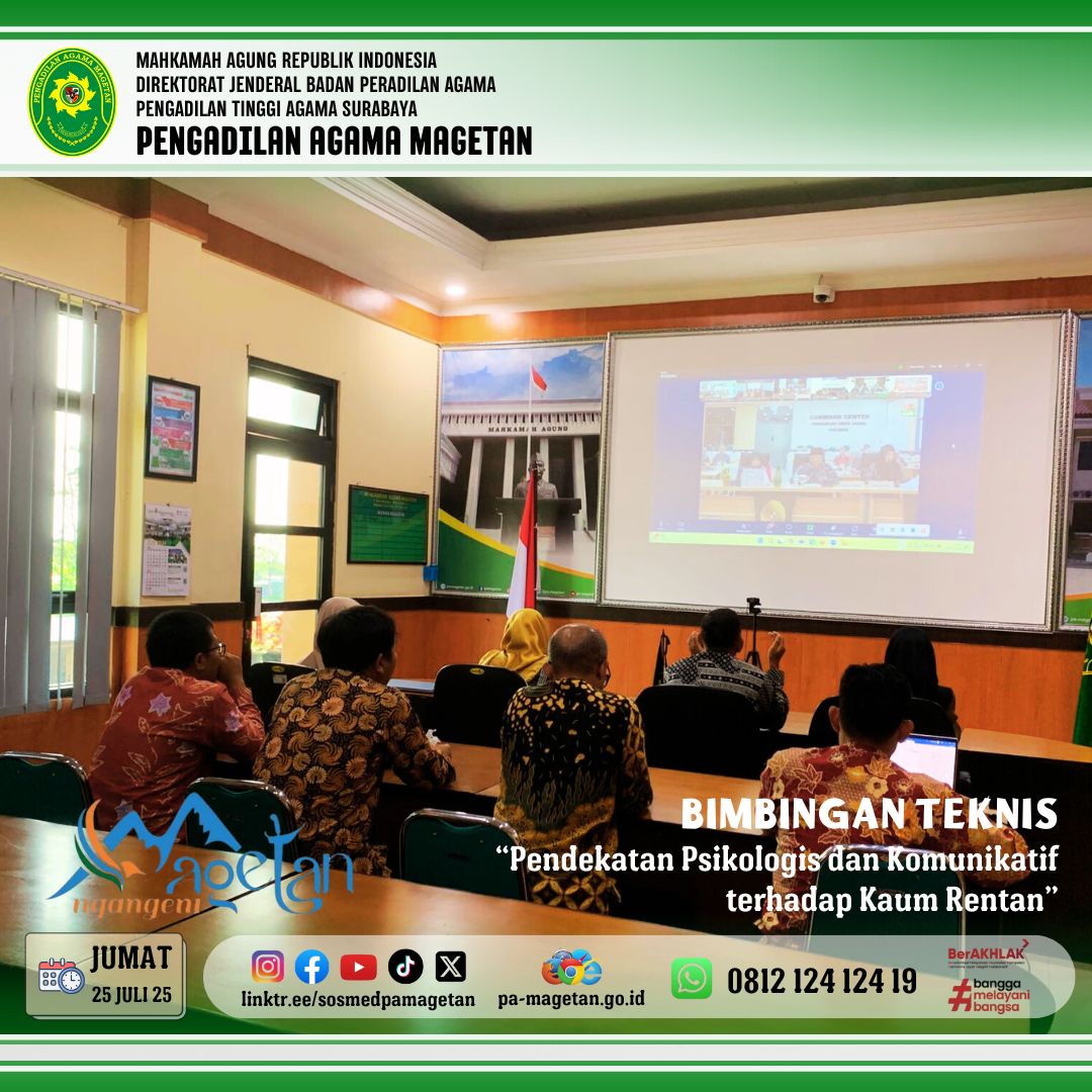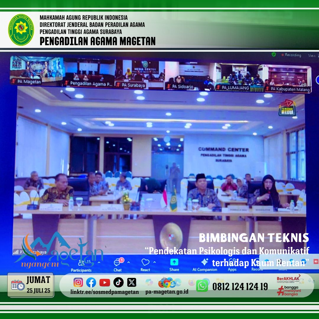 Magetan | pa-magetan.go.id | Pengadilan Agama Magetan mengikuti Bimbingan Teknis (Bimtek) Kaum Rentan Berhadapan dengan Hukum, Jumat, 25 Juli 2025, Direktorat Jenderal Badan Peradilan Agama (Badilag) Mahkamah Agung RI mengadakan Bimbingan Teknis (Bimtek) Kaum Rentan Berhadapan dengan Hukum dengan tema "Komunikasi Terhadap Kaum Rentan" yang dilaksanakan secara daring (online) yang dihadiri oleh Para tenaga teknis di lingkungan Peradilan Agama, termasuk Ketua, Wakil Ketua, Hakim, Panitera, Panitera Muda, Panitera Pengganti, dan Jurusita di berbagai Pengadilan Agama di seluruh Indonesia.