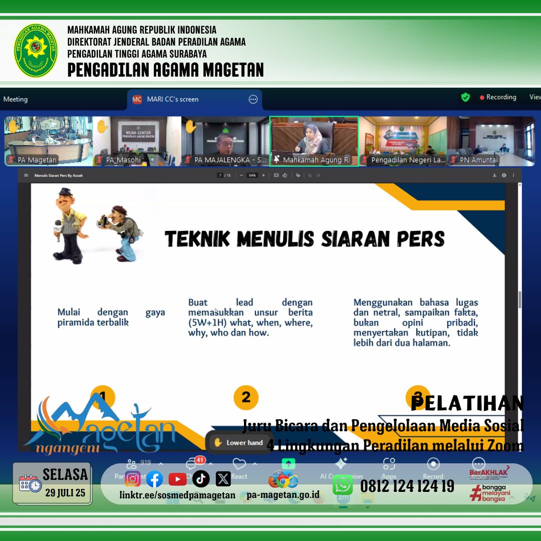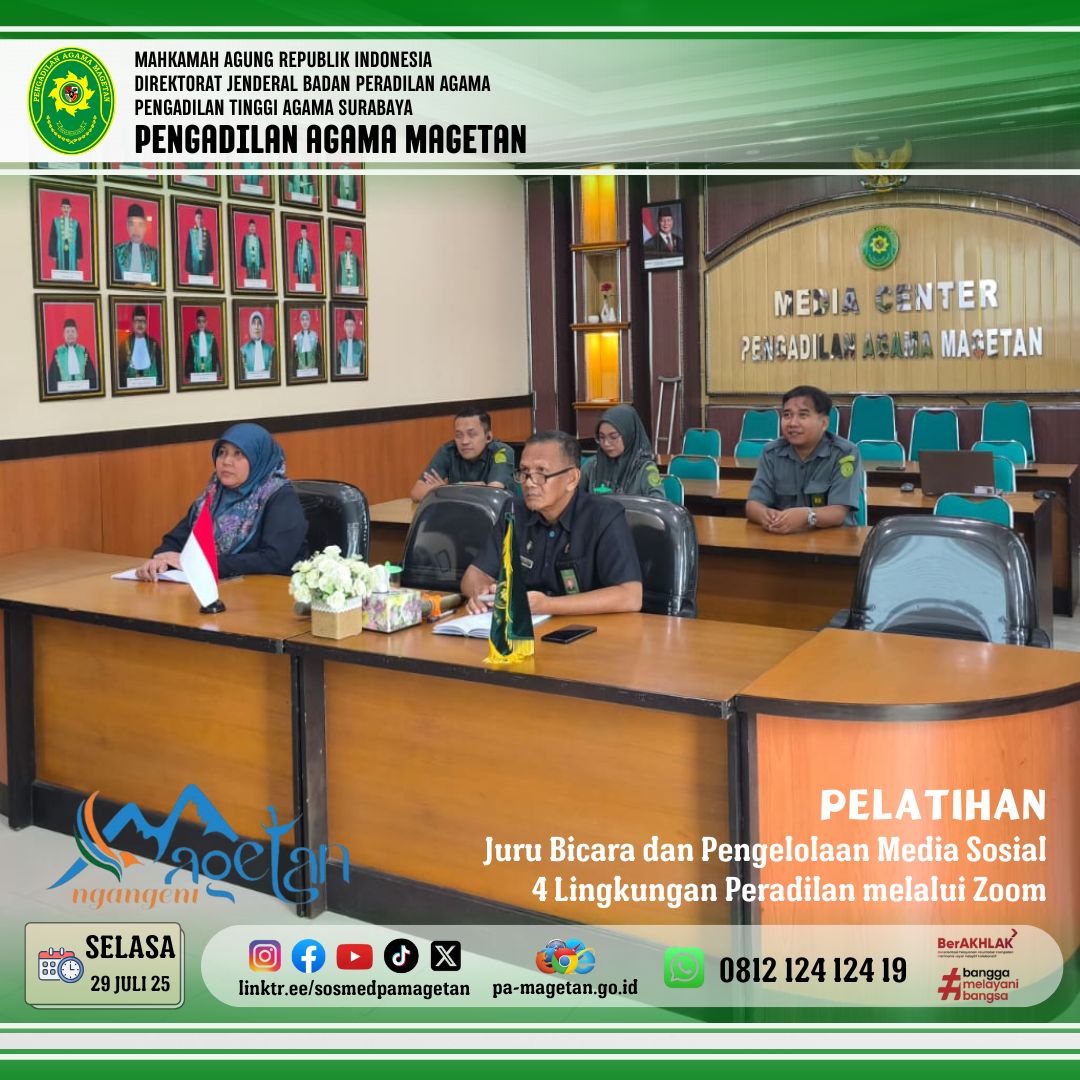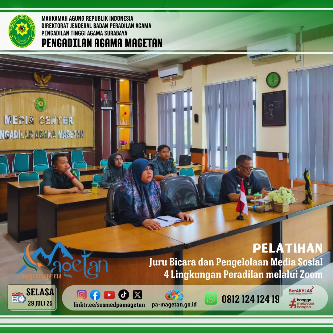 Magetan, 29 Juli 2025 — Dalam rangka memperkuat strategi komunikasi publik dan meningkatkan kapasitas pengelolaan informasi, Pengadilan Agama Magetan mengikuti Pelatihan Juru Bicara dan Pengelolaan Media Sosial pada Empat Lingkungan Peradilan yang diselenggarakan secara daring melalui Zoom Meeting. Kegiatan ini berlangsung di Media Center Pengadilan Agama Magetan dan diikuti oleh perwakilan humas dan pengelola media sosial.