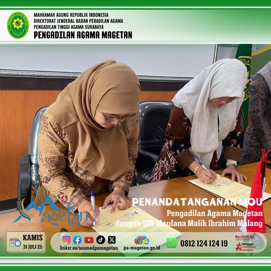 Magetan | pa-magetan.go.id | Pada hari Kamis (31/07/2025)Pengadilan Agama Magetan Jalin Kerja Sama dengan UIN Maulana Malik Ibrahim Malang. Pengadilan Agama Magetan menandatangani nota kesepahaman (MoU) dengan Universitas Islam Negeri Maulana Malik Ibrahim Malang sebagai bentuk sinergi dalam bidang pendidikan, penelitian, dan pengabdian masyarakat. Penandatanganan dilakukan di Kantor Pengadilan Agama Magetan pada Selasa, 30 Juli 2025. Kegiatan ini dihadiri oleh pimpinan dari kedua lembaga serta jajaran pendukung dan mahasiswa. MoU ini menjadi dasar resmi pelaksanaan praktik lapangan dan kerja sama kelembagaan ke depan.