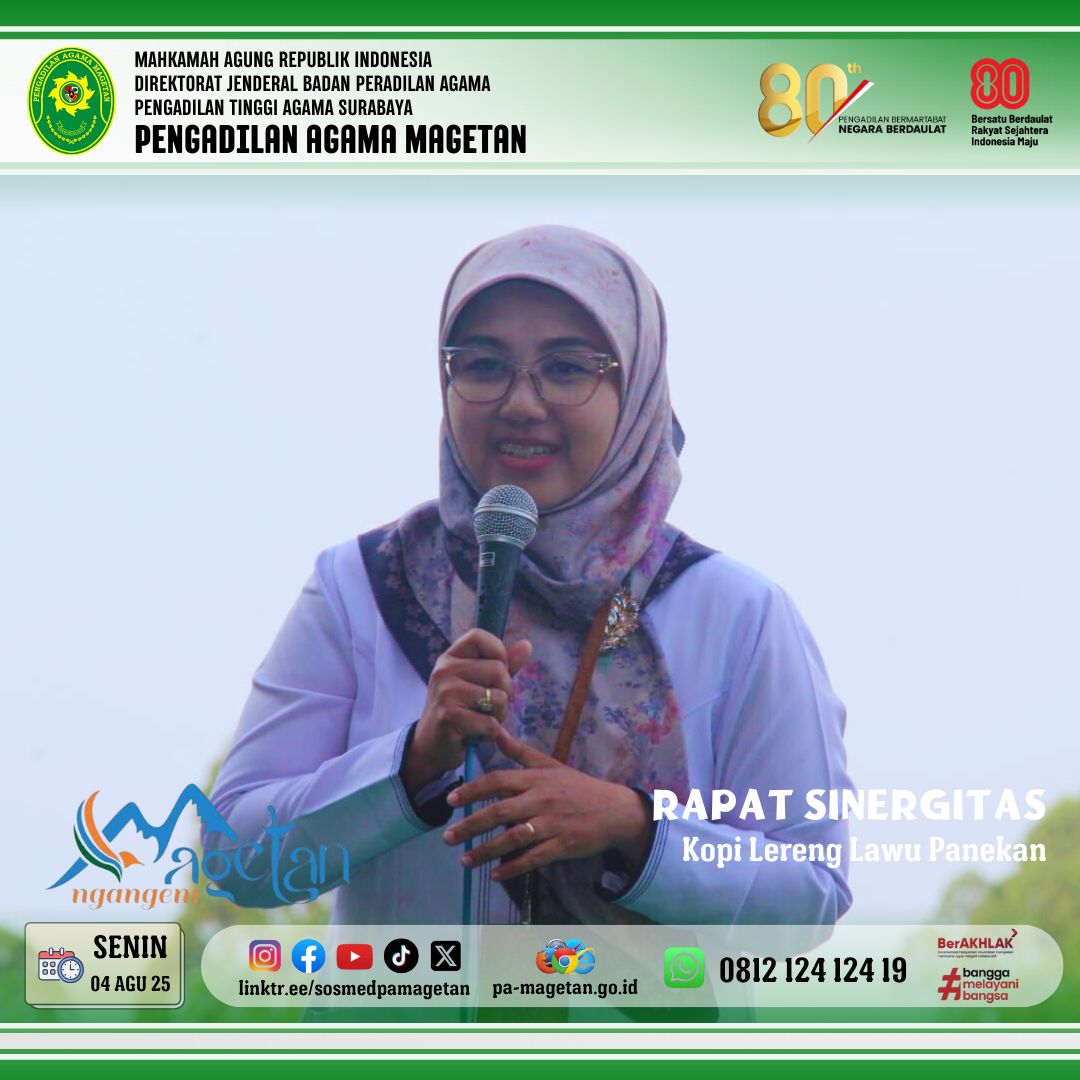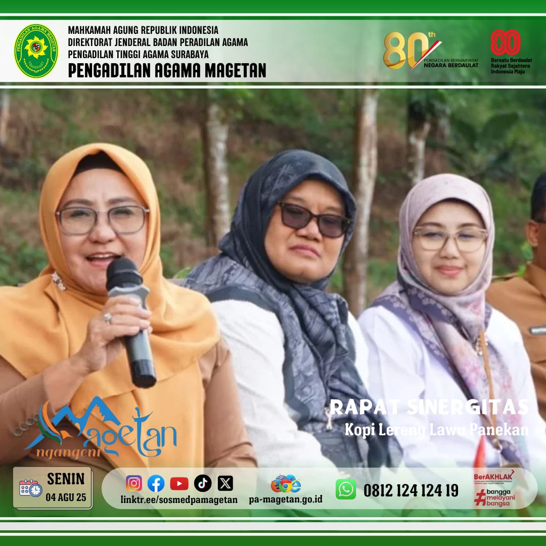 Rapat koordinasi Forkopimda digelar pada Senin, 4 Agustus 2025 di Dukuh Trolelo, Desa Ngiliran, Kecamatan Panekan, Kabupaten Magetan. Acara ini membahas sharing tentang pengembangan budidaya kopi antara pihak desa dan Forkopimda. Bupati Magetan hadir langsung memimpin jalannya rapat koordinasi tersebut. Ketua Pengadilan Agama Magetan Ibu Dr. Hermin Sriwulan, S.H.I., S.H., M.H.I., turut hadir mewakili lembaganya dalam kegiatan ini.