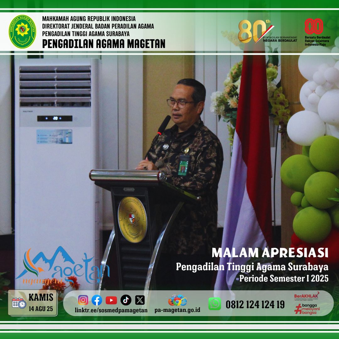 Magetan | pa-magetan.go.id | Pada Kamis (14/08/2025). Pengadilan Agama Magetan Hadiri Pembinaan KPTA, PTA Surabaya Award, dan Diskusi Hukum. Bertempat di Aula Pengadilan Tinggi Agama Surabaya, telah dilaksanakan kegiatan pembinaan yang diisi oleh Hakim Agung Mahkamah Agung RI, Dr. H. Imron Rosyadi, S.H., M.H., dengan materi “Peningkatan Integritas dan Kualitas SDM Peradilan”. Selain itu, Drs. Arief Hidayat, S.H., M.M., Sesditjen Badan Peradilan Agama Mahkamah Agung RI, juga memberikan pembinaan dengan topik “Integritas Pengelolaan dan Penatausahaan Administrasi Kesekretariatan”, penyerahan PTA Surabaya Award Peradilan Agama Semester I Tahun 2025, serta diskusi hukum. Kegiatan ini diikuti oleh seluruh satuan kerja peradilan agama di wilayah hukum PTA Surabaya. Agenda tersebut dirancang sebagai sarana pembinaan, evaluasi kinerja, apresiasi, dan penguatan pemahaman hukum bagi aparatur peradilan. Suasana berlangsung resmi namun tetap interaktif.