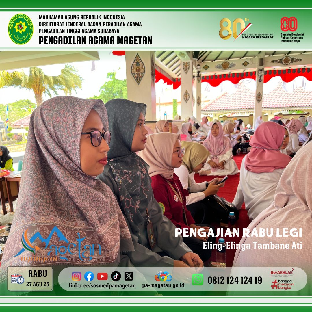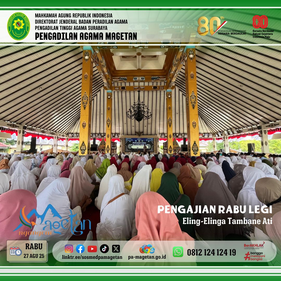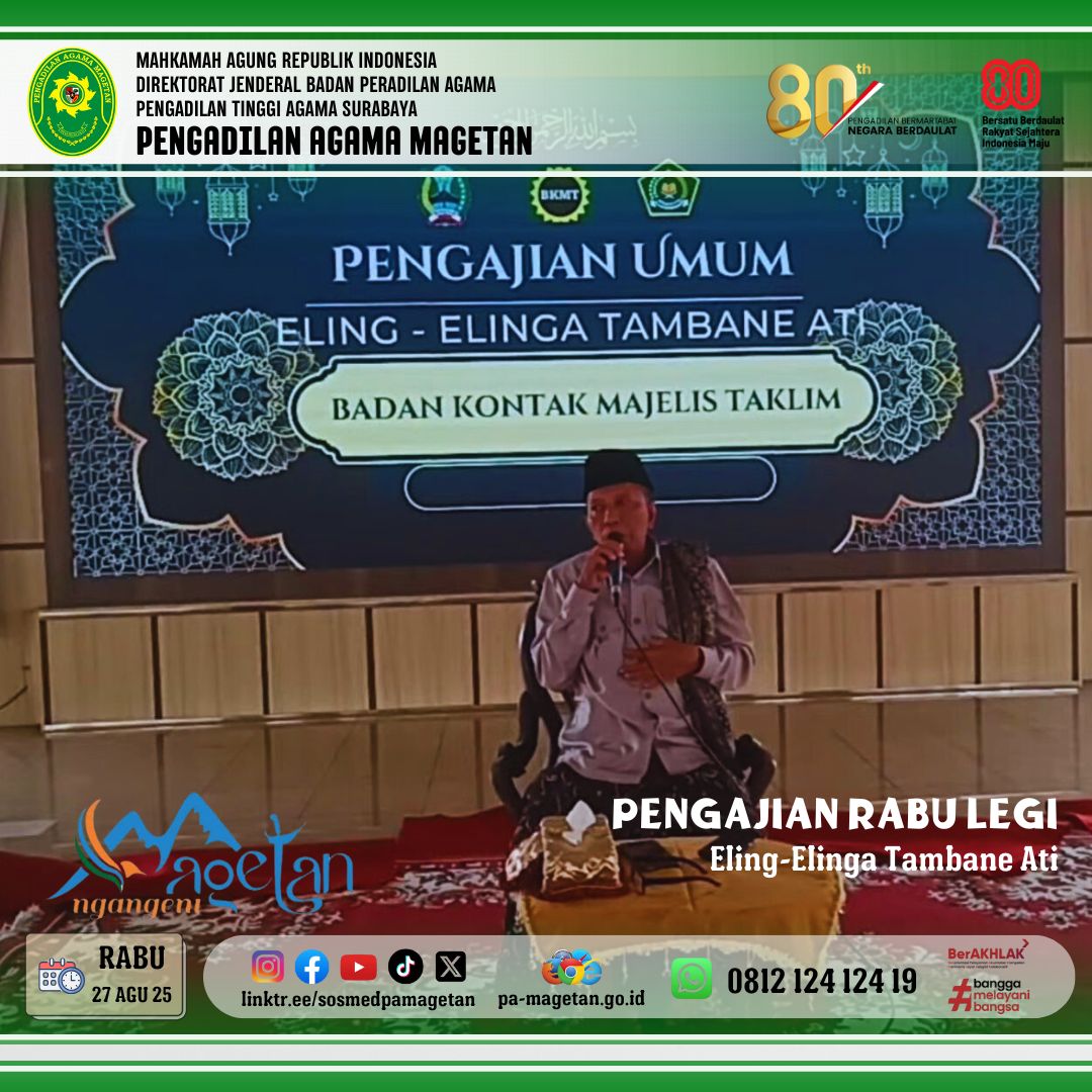 Magetan | pa-magetan.go.id | Magetan | Badan Kontak Majelis Taklim (BKMT) Kabupaten Magetan kembali menyelenggarakan pengajian rutin Rabu Legi pada Rabu (27/08/2025). Kegiatan ini dilaksanakan di Pendopo Surya Graha Pemkab Magetan. Acara dihadiri oleh jamaah majelis taklim dari berbagai Instansi dan masyarakat di Kabupaten Magetan. Pengajian ini bertujuan memperkuat ukhuwah islamiyah serta meningkatkan pemahaman keagamaan masyarakat.