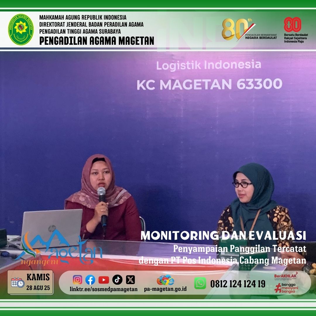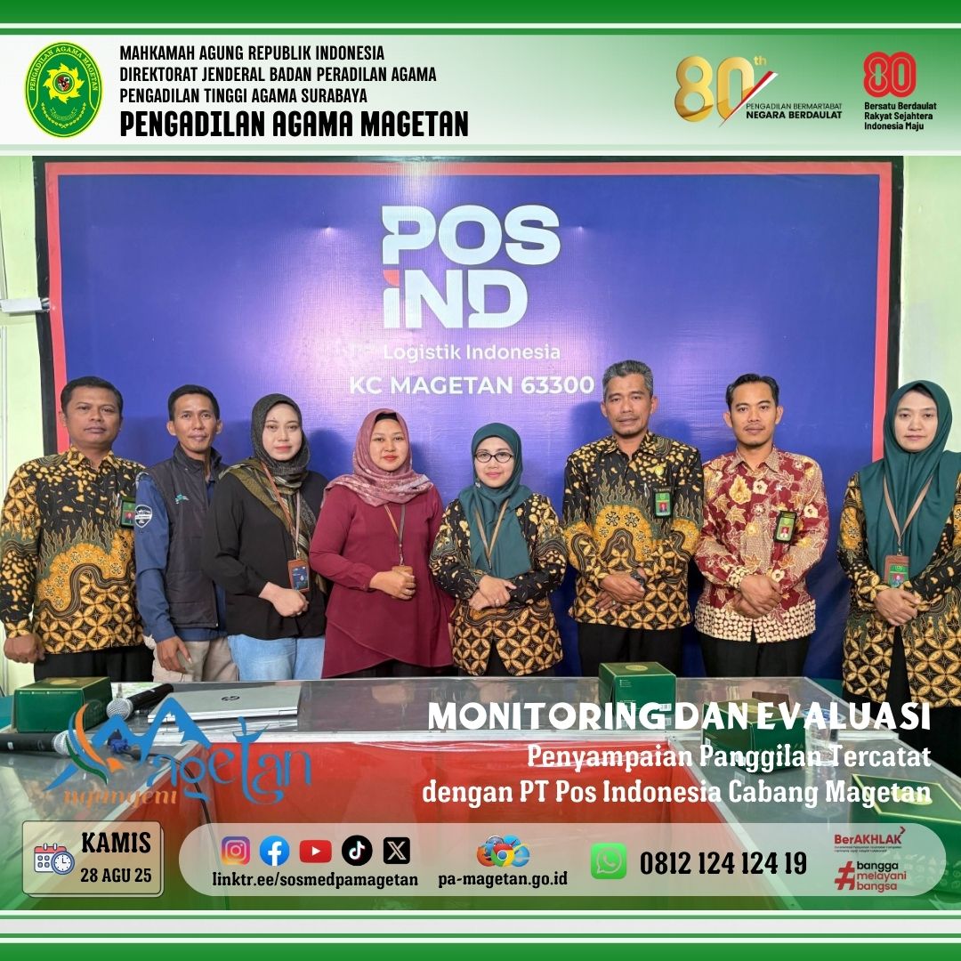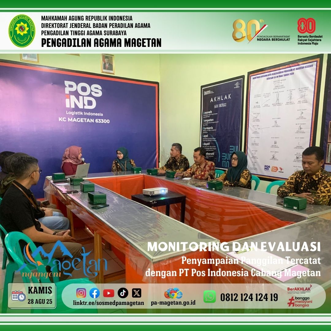 Magetan | pa-magetan.go.id |Kamis (28/8/2025) Magetan Pengadilan Agama Magetan melaksanakan kegiatan monitoring dan evaluasi terkait pengiriman relas bekerja sama dengan Kantor Pos Magetan. Kegiatan ini dilakukan untuk memastikan ketepatan, kecepatan, serta keamanan pengiriman relaas kepada para pihak berperkara. Pertemuan berlangsung di kantor Pos Magetan dengan suasana koordinatif dan terbuka. Hadir dalam kegiatan tersebut perwakilan dari jajaran pimpinan Ketua Dr. Hermin Sriwulan, S.H.I., S.H., M.H.I.,,Wakil, Hakim Panitera dan Sekretaris dan Perwakilan Kantor Pos Magetan Eksekutif Manager Kantor Pos Cabang Magetan Bonita Indriyana beserta jajarannya.