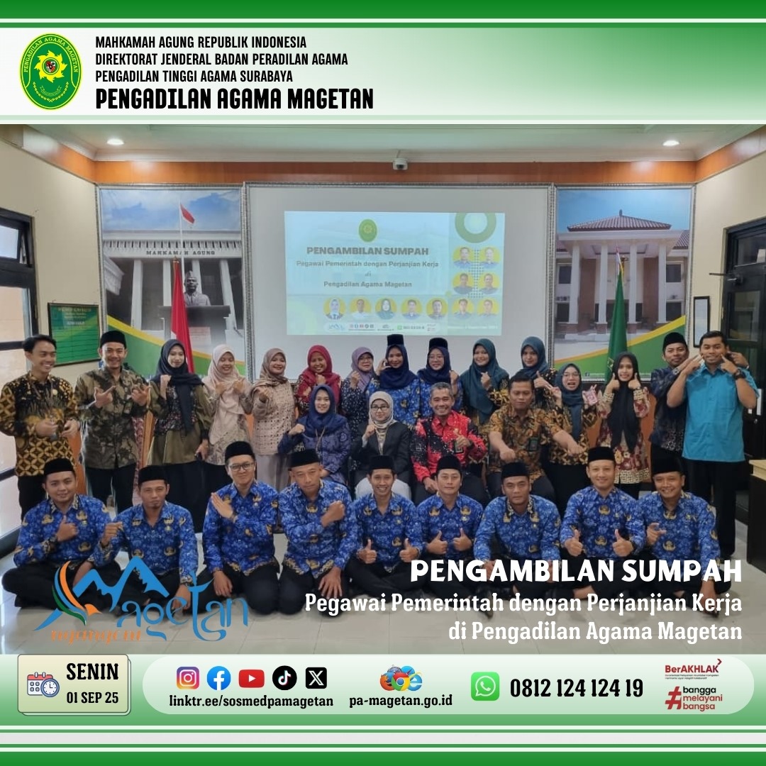 Pada hari ini, Senin, 1 September 2025, bertempat di media center Pengadilan Agama (PA) Magetan, telah dilaksanakan acara Pengambilan Sumpah Pegawai Pemerintah dengan Perjanjian Kerja (PPPK). Acara dimulai pukul 08.00 WIB dan dipimpin langsung oleh Ketua Pengadilan Agama Dr. Hermin Sriwulan, S.H.I., S.H., M.H.I. Sebanyak 11 orang pegawai PPPK mengikuti prosesi pengambilan sumpah dan penandatanganan berita acara sumpah.