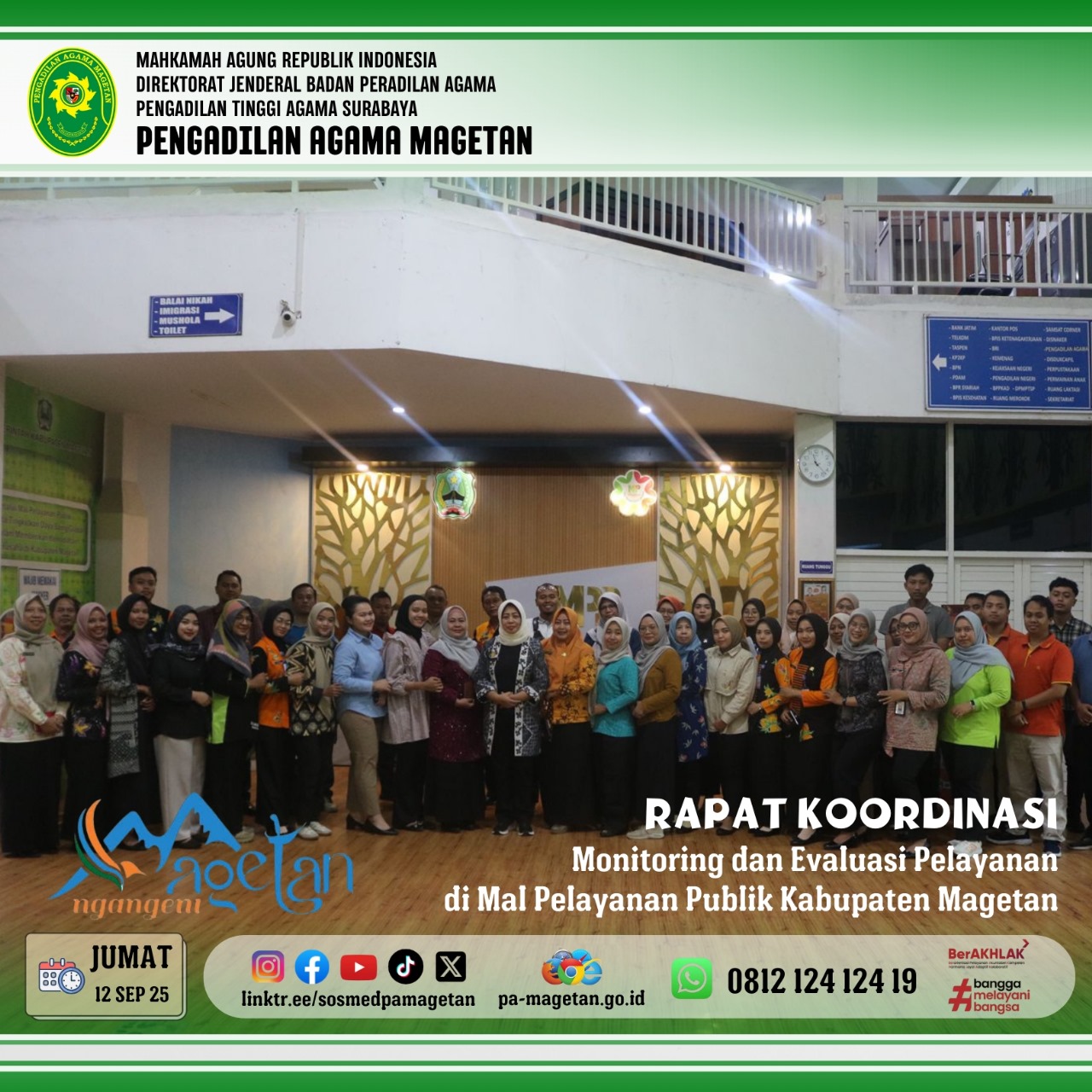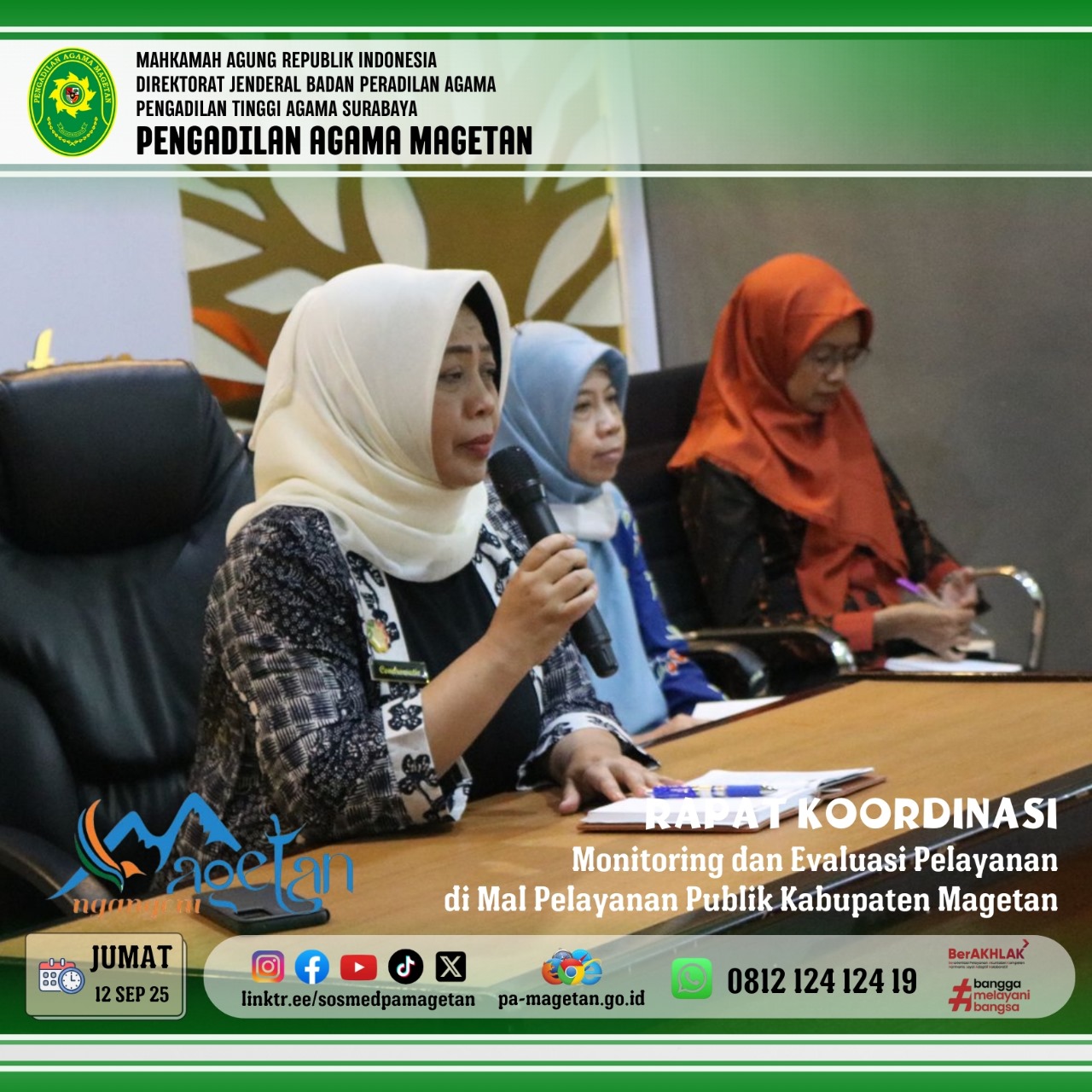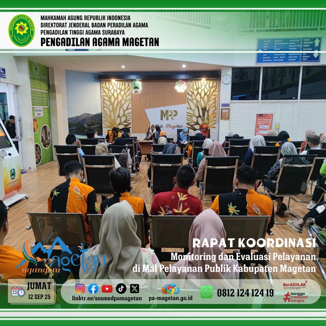 Magetan | pa-magetan.go.id | Pada hari Jumat, 12 September 2025 pukul 11.00, Pengadilan Agama Magetan menghadiri rapat koordinasi yang diselenggarakan oleh Dinas Penanaman Modal dan Pelayanan Terpadu Satu Pintu (DPMPTSP) Kabupaten Magetan. Kegiatan ini bertempat di ruang rapat Mall Pelayanan Publik (MPP) Kabupaten Magetan. Rapat tersebut dihadiri oleh berbagai instansi terkait, termasuk perwakilan dari Pengadilan Agama Magetan yang diwakili oleh Ibu Amalia Setya Marlisa, S.Ak. Tujuan utama acara ini adalah untuk melakukan monitoring dan evaluasi terhadap pelayanan yang diberikan di MPP.