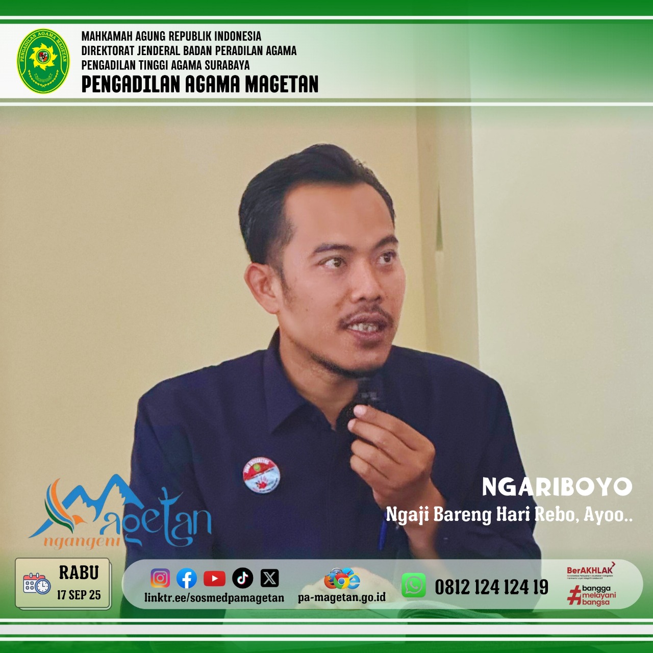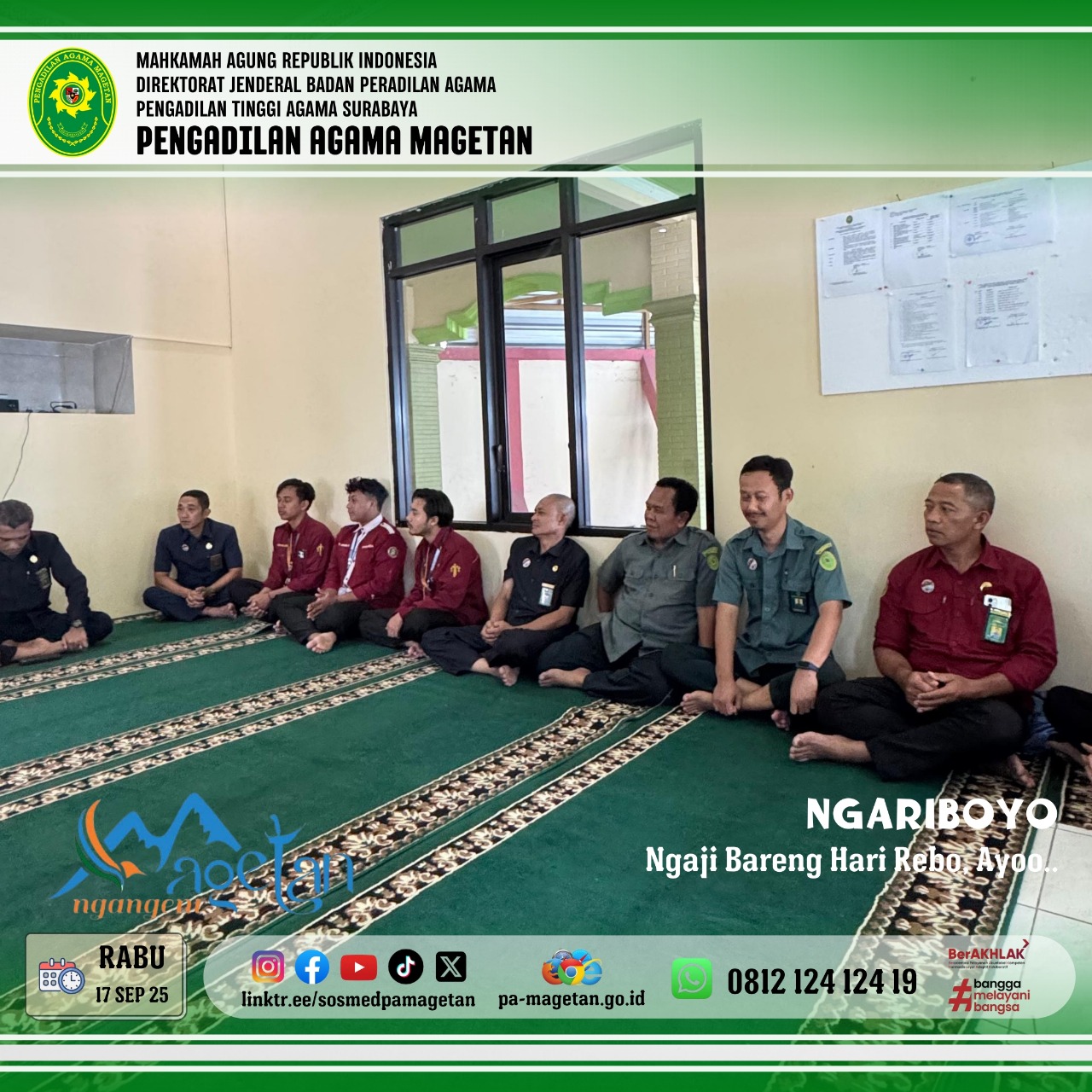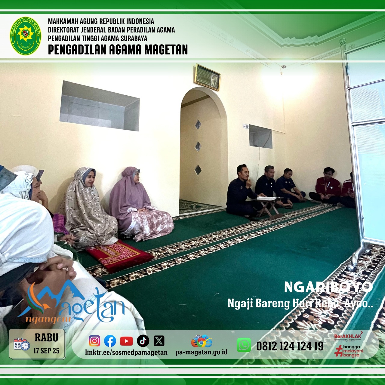 Magetan | pa-magetan.go.id | Rabu (17/09/2025), Pengadilan Agama Magetan kembali menyelenggarakan kegiatan rutin NGARIBOYO (Ngaji Hari Rabo Ayoooo...) di Musholla Al Mahkamah. Acara tersebut diikuti oleh para pegawai dan jamaah dengan penuh khidmat. Kegiatan ini bertujuan untuk meningkatkan pemahaman agama sekaligus mempererat ukhuwah. Suasana berjalan tertib dan penuh semangat kebersamaan.