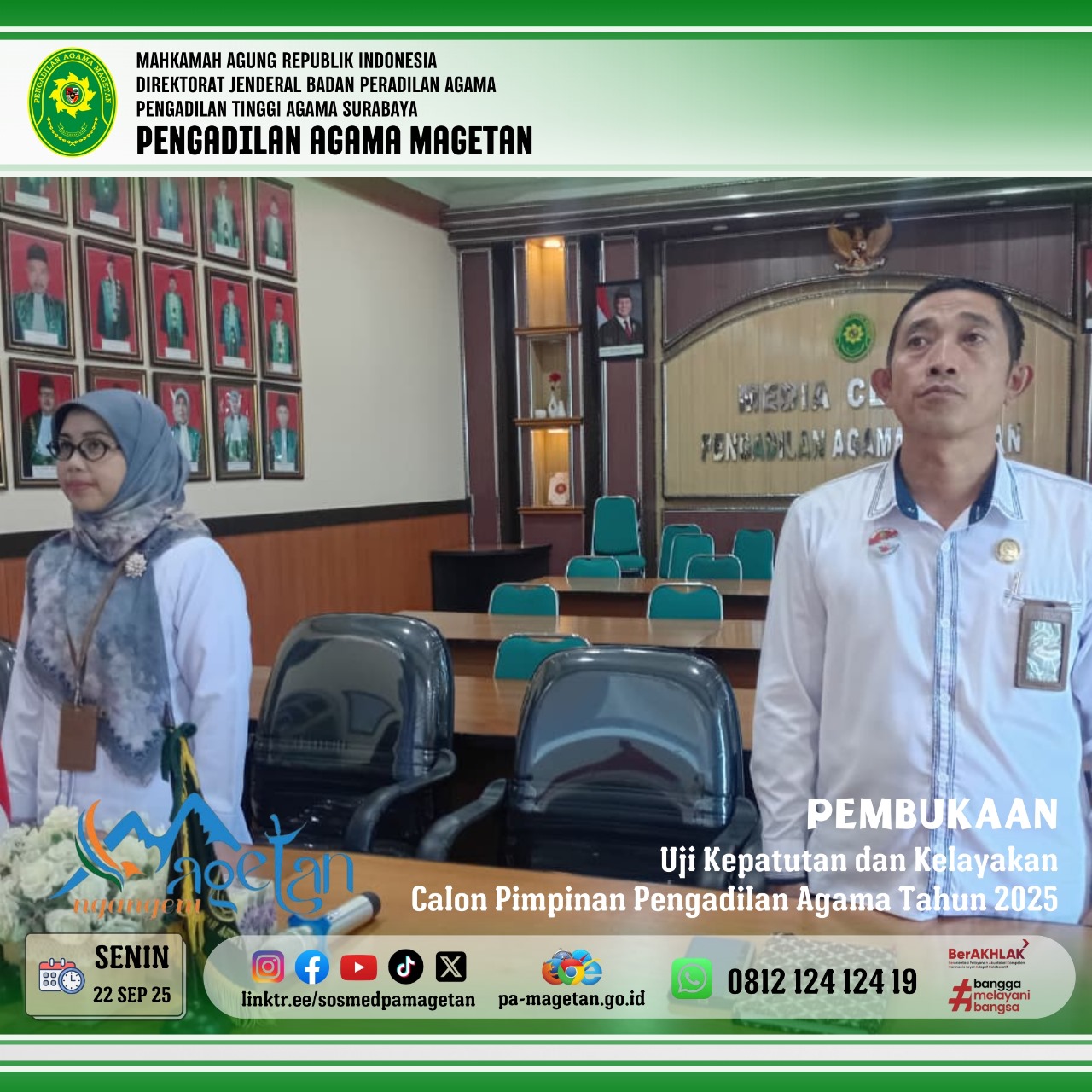 Magetan | pa-magetan.go.id | Direktorat Jenderal Badan Peradilan Agama mengadakan upacara pembukaan kegiatan Uji Kepatuhan dan Kelayakan (Fit and Proper Test) calon pimpinan pengadilan di lingkungan Peradilan Agama tahun 2025. Acara tersebut dilaksanakan secara virtual melalui aplikasi Zoom pada Senin, 22 September 2025, pukul 08.00 WIB. Upacara ini dihadiri oleh Dirjen Badilag MA, Pimpinan Pengadilan Tingkat Banding, Pimpinan Pengadilan Tingkat Pertama, para Penguji, dan Peserta dari pengadilan agama. Hadir pula Ketua Pengadilan Agama Magetan Dr. Hermin Sriwulan, S.H.I., S.H., M.H.I. dan Luqman Hariyadi, S.H., M.H., sebagai hakim/peserta yang mengikuti fit and proper test.