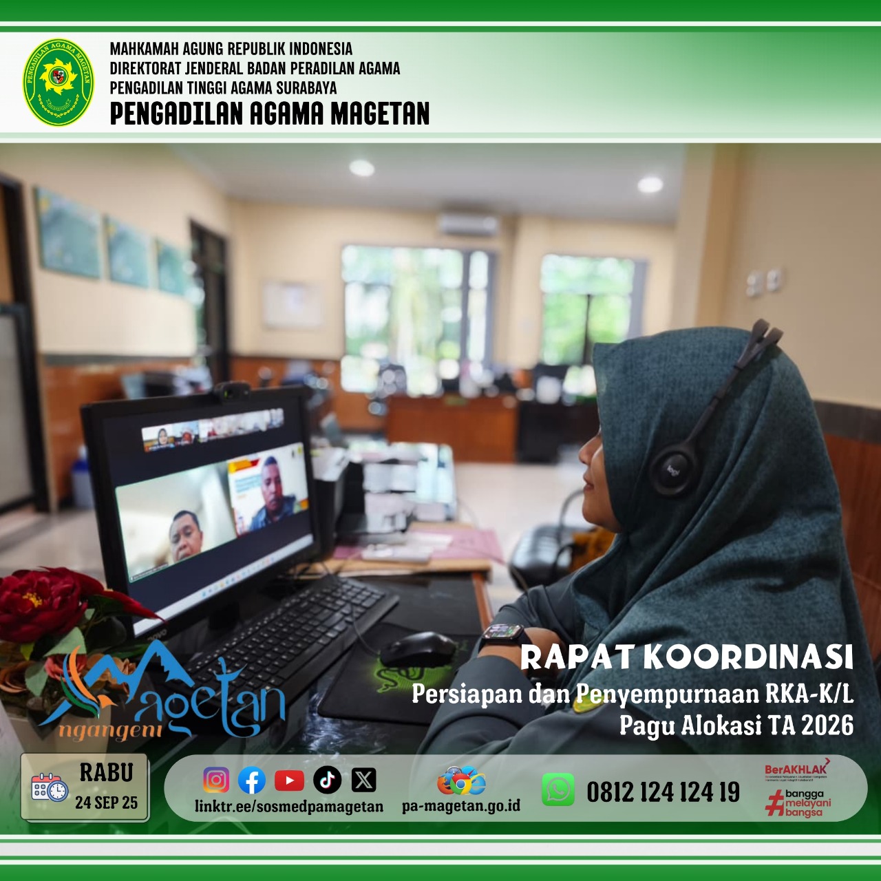 Magetan | pa-magetan.go.id | – Plt. Sekretaris Pengadilan Agama Magetan, Ria Eko Wahyudi, S.Kom., yang diwakili oleh Klerek Penelaah Teknis Kebijakan, Titin Oktaviani, S.IAN, mengikuti Rapat Persiapan dan Penyempurnaan Penyusunan RKA-K/L Pagu Alokasi Tahun Anggaran 2026. Kegiatan tersebut dilaksanakan secara daring pada hari Rabu (24/09/2025) pukul 13.30 WIB. Rapat dipimpin oleh Kepala Biro Perencanaan dan Organisasi Badan Urusan Administrasi Mahkamah Agung RI, H. Sahwan, S.H., M.H. serta diikuti oleh seluruh satuan kerja Pengadilan Tingkat Banding dan Tingkat Pertama di empat lingkungan peradilan se-Indonesia.