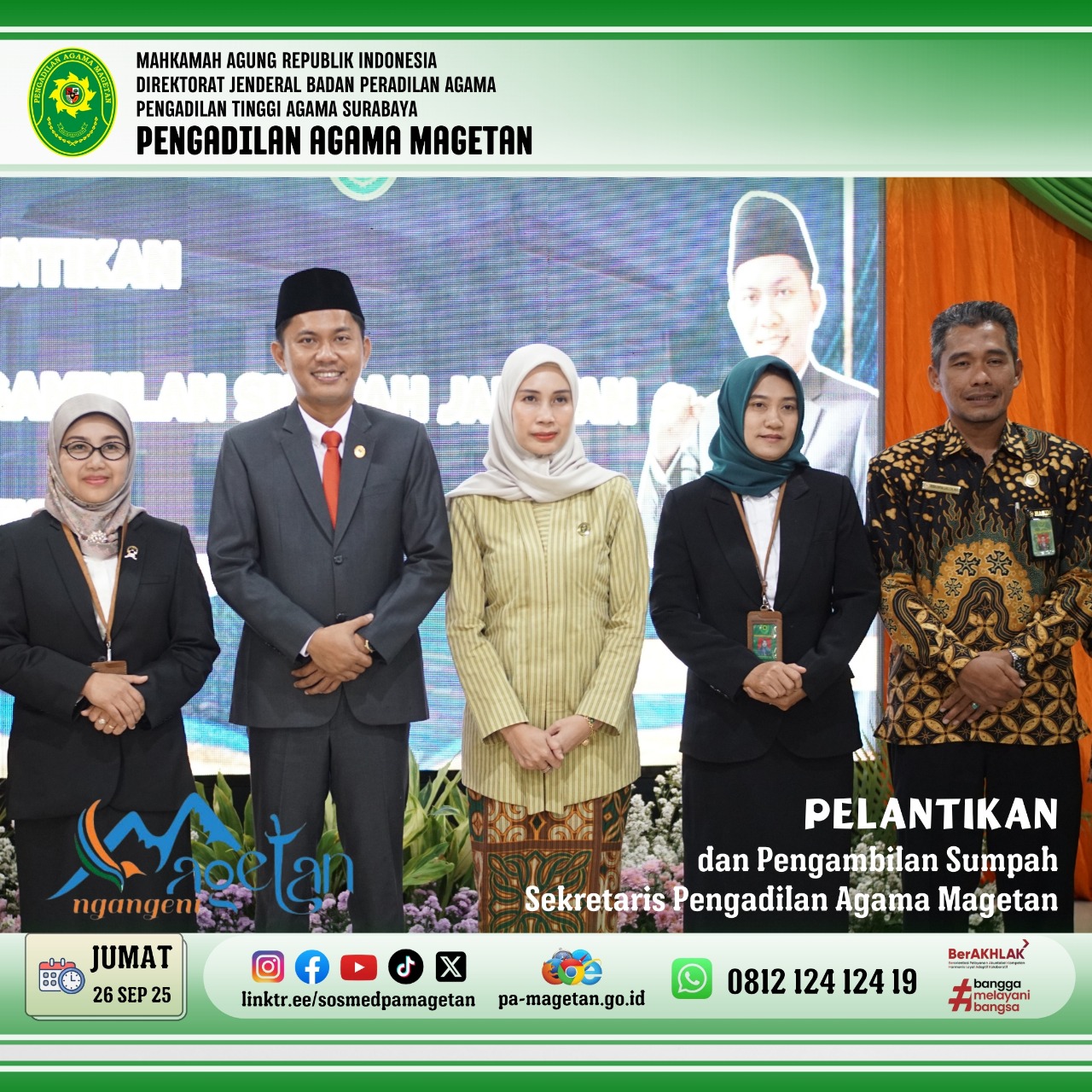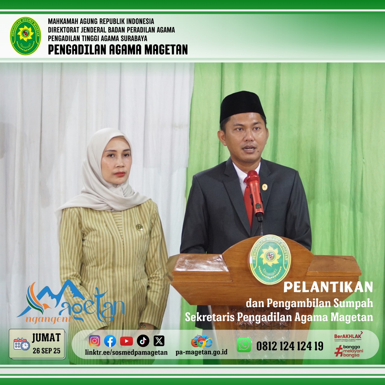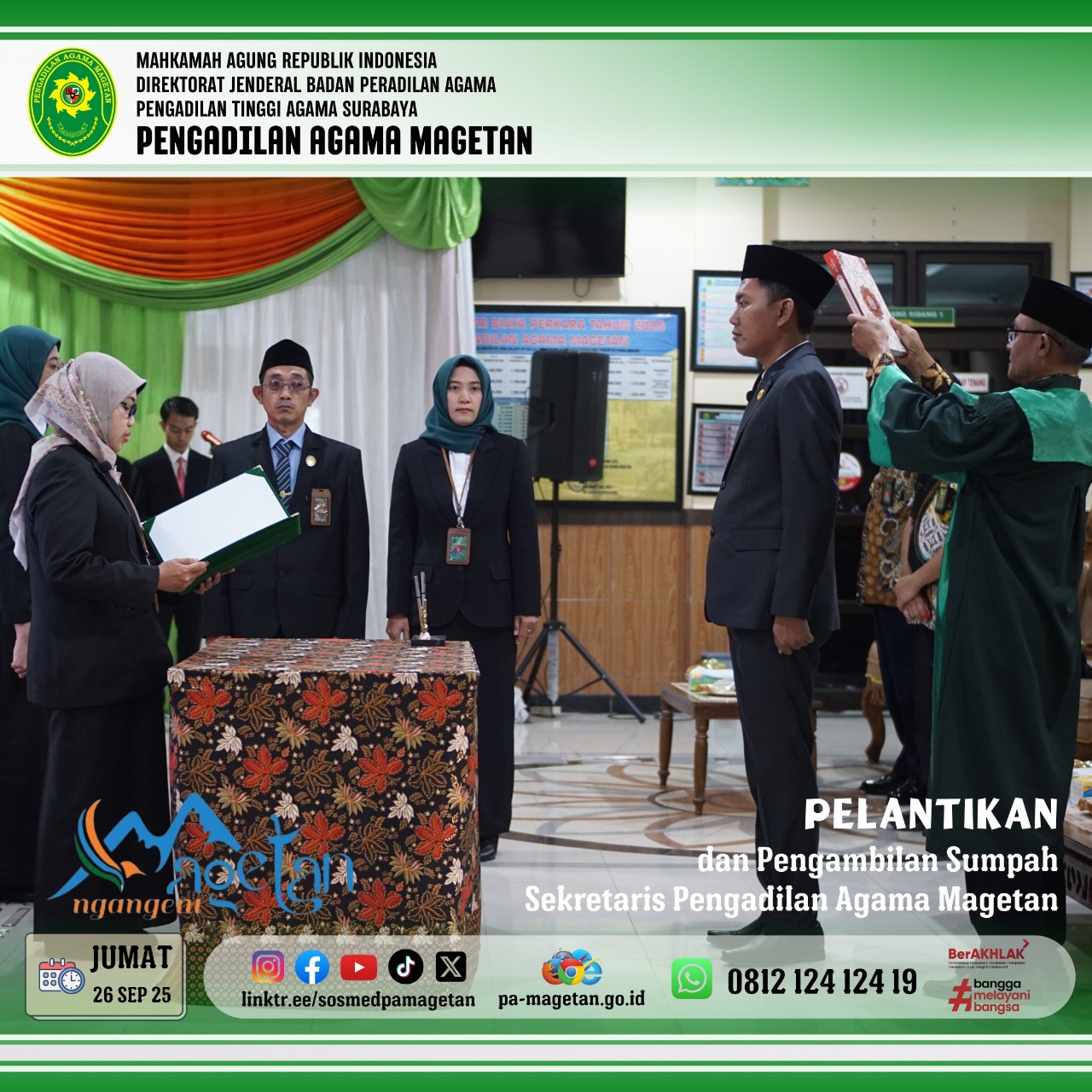 Magetan | pa-magetan.go.id| Pada hari Jumat, tanggal 26 September 2025 pukul 09.00 WIB, Pengadilan Agama Magetan menggelar acara pelantikan Sekretaris baru. Acara ini berlangsung di lingkungan Pengadilan Agama Magetan dengan suasana yang khidmat dan tertib. Bapak Onis Nur Islahi, S.sos., M.M., resmi dilantik sebagai Sekretaris baru oleh Ketua Pengadilan Agama Magetan Ibu Dr. Hermin Sriwulan, S.H.I., S.H., M.H.I.. Pelantikan ini menjadi momentum penting dalam upaya memperkuat kinerja manajemen dan pelayanan di lingkungan peradilan agama.