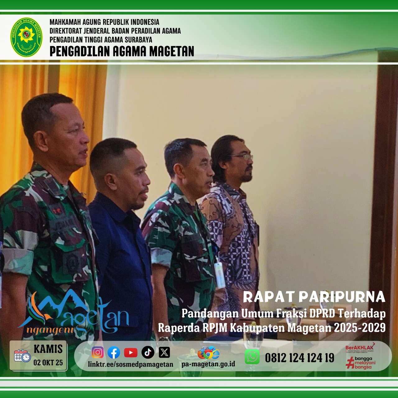 Magetan | pa-magetan.go.id | Kamis (02/10/2025) Pengadilan Agama Magetan menghadiri Rapat Paripurna DPRD Kabupaten Magetan dengan agenda Pandangan Umum Fraksi DPRD terhadap Rancangan Peraturan Daerah (Raperda) RPJMD Kabupaten Magetan Tahun 2025–2029. Kegiatan ini digelar di Gedung DPRD Kabupaten Magetan dengan dihadiri jajaran pemerintah daerah serta unsur Forkopimda.