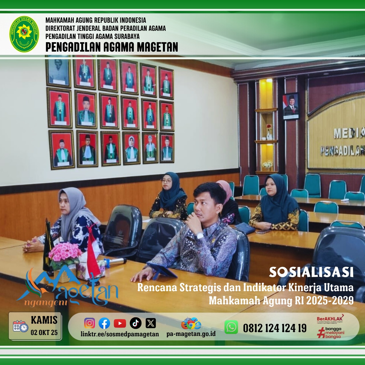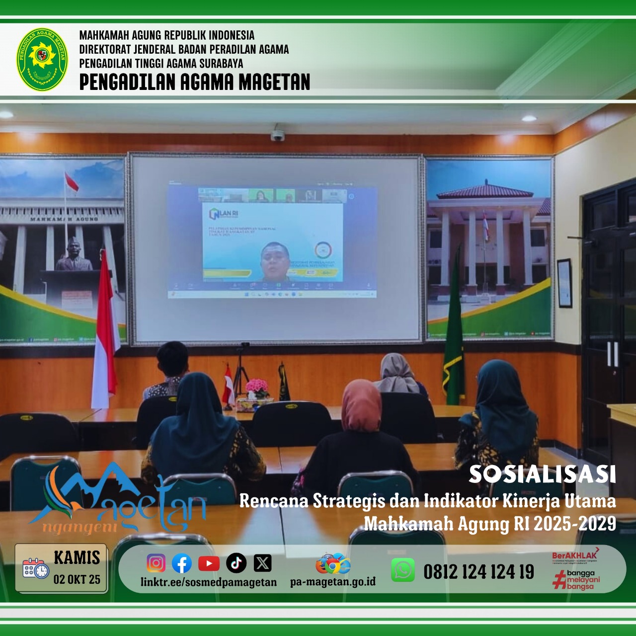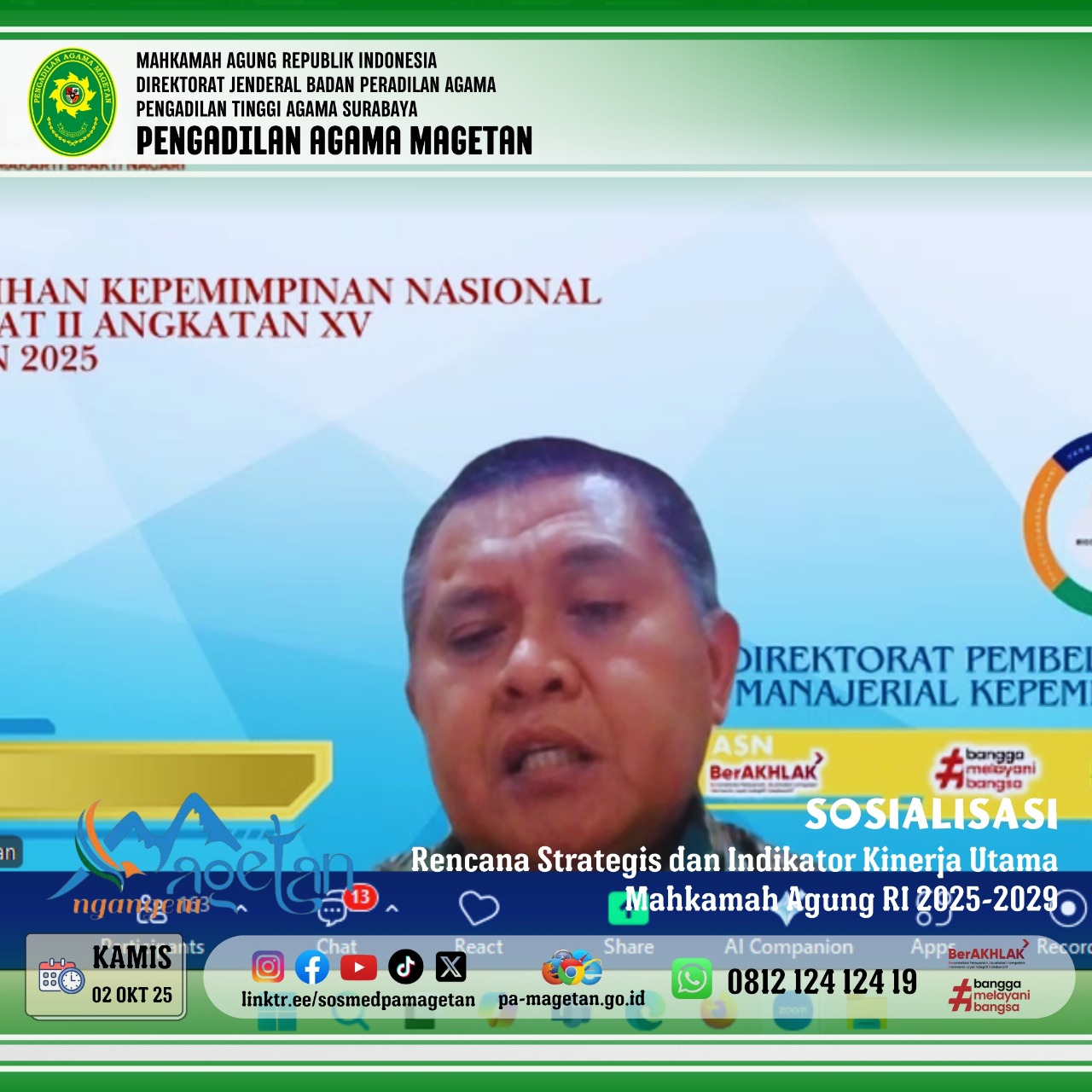 Magetan | pa-magetan.go.id | PA Magetan Hadiri Sosialisasi Renstra dan IKU MA RI. Menindaklanjuti surat Sekretaris Mahkamah Agung Nomor 15213/SEK/RA1.3/IX/2025, Mahkamah Agung RI menyelenggarakan Sosialisasi Rencana Strategis dan Indikator Kinerja Utama (IKU) Mahkamah Agung Tahun 2025–2029. Kegiatan ini dilaksanakan secara daring melalui aplikasi Zoom Meeting pada tanggal 2 Oktober 2025.