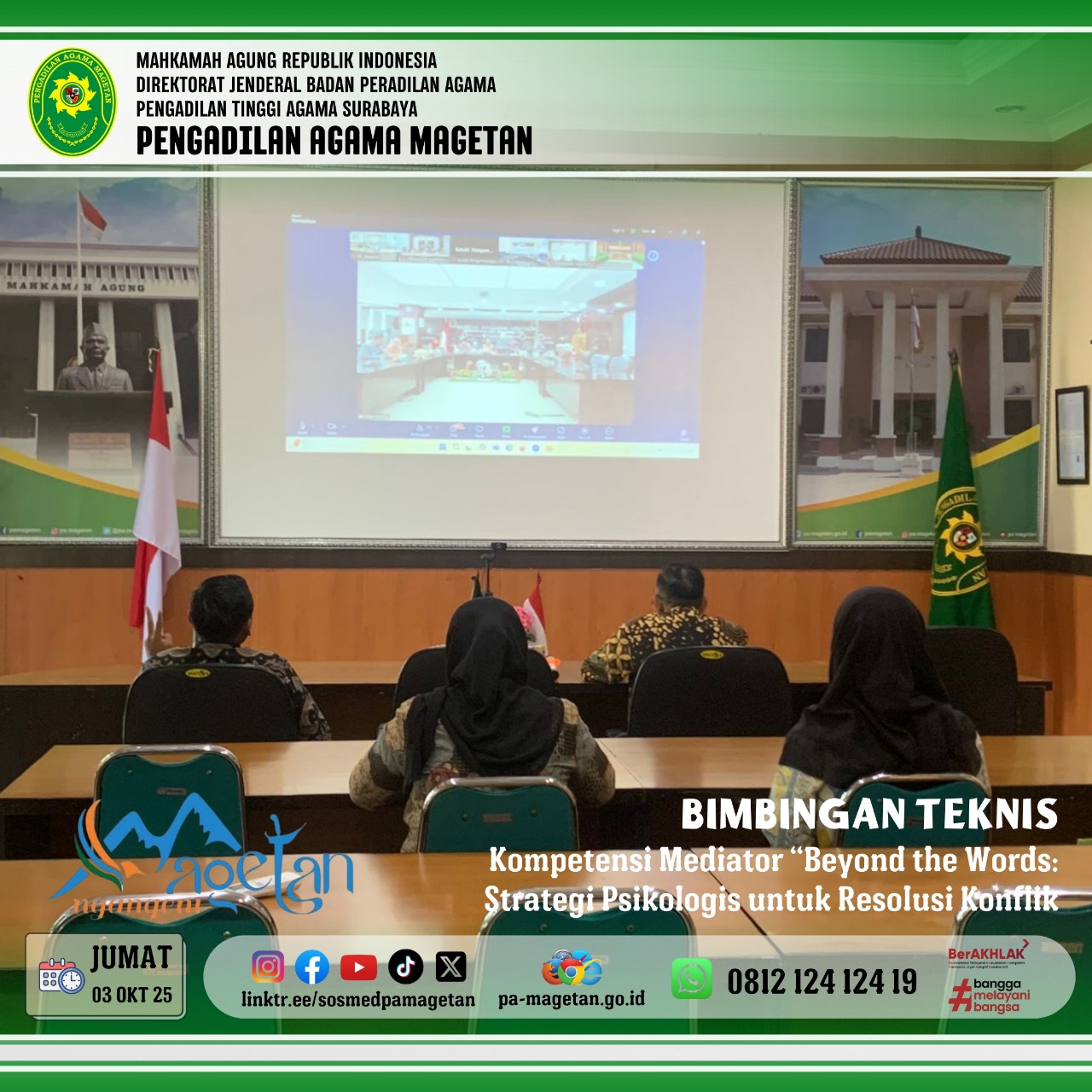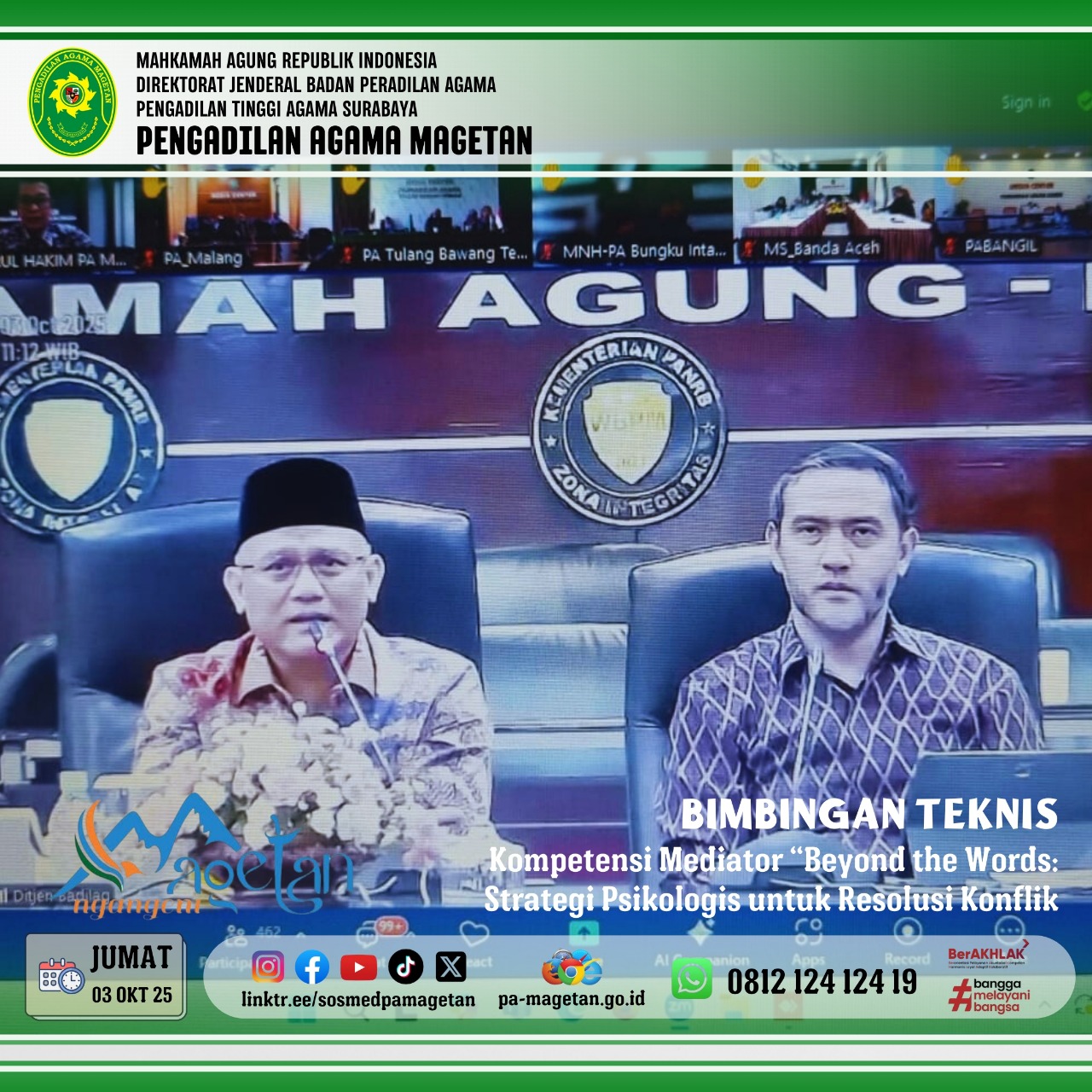 Magetan | pa-magetan.go.id| Pada hari Jumat, tanggal 03 Oktober 2025, para Hakim Pengadilan Agama Magetan mengikuti kegiatan bimbingan teknis peningkatan kompetensi mediator. Kegiatan ini dilaksanakan secara daring mulai pukul 08.00 WIB dan berlokasi di Media Center Pengadilan Agama Magetan. Bimbingan teknis tersebut diselenggarakan sebagai bentuk upaya peningkatan kemampuan para hakim dalam melaksanakan fungsi mediasi di lingkungan peradilan agama. Kegiatan ini diikuti dengan antusias oleh seluruh peserta yang hadir.