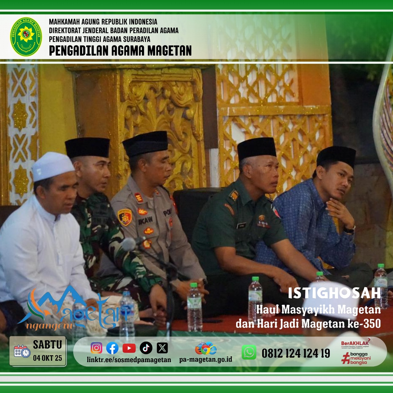 Berbagai unsur pimpinan daerah tampak hadir, menunjukkan sinergi antara ulama dan umaro. Di antara hadirin, Pengadilan Agama Magetan diwakili secara langsung oleh sekretaris, Bapak Onis Nur Islahi, S.Sos., M.M., yang turut serta dalam seluruh rangkaian acara. Kehadiran beliau menegaskan komitmen institusi peradilan agama dalam mendukung kegiatan keagamaan dan pelestarian nilai-nilai luhur daerah.