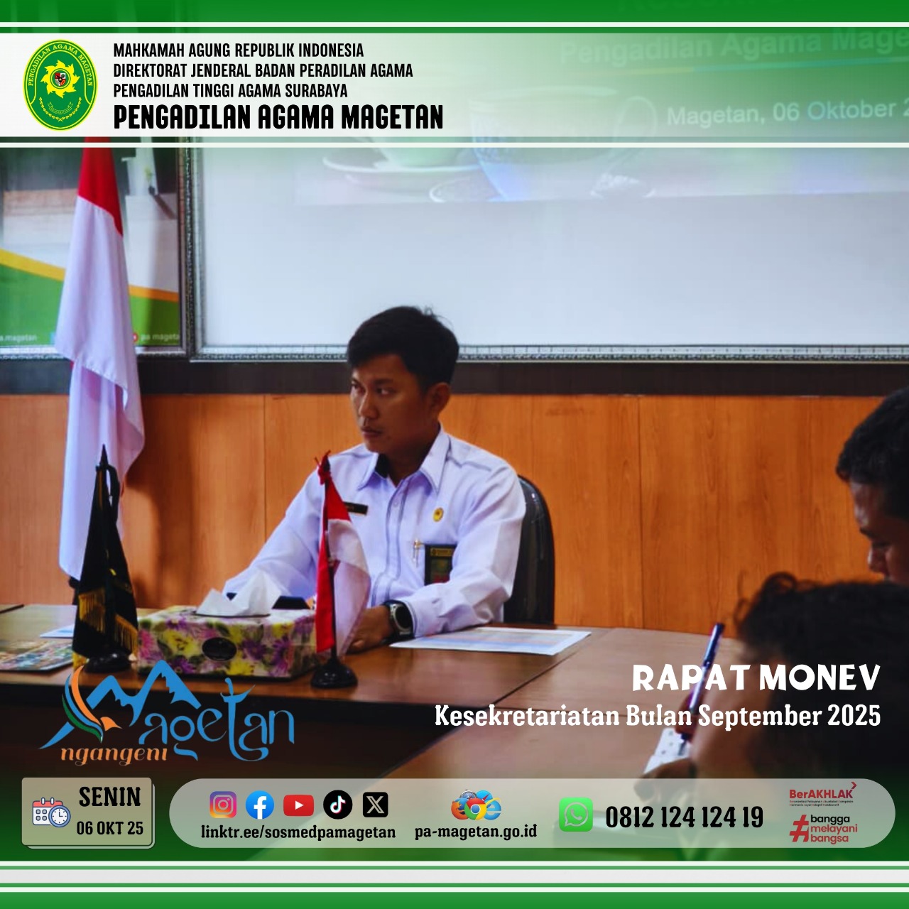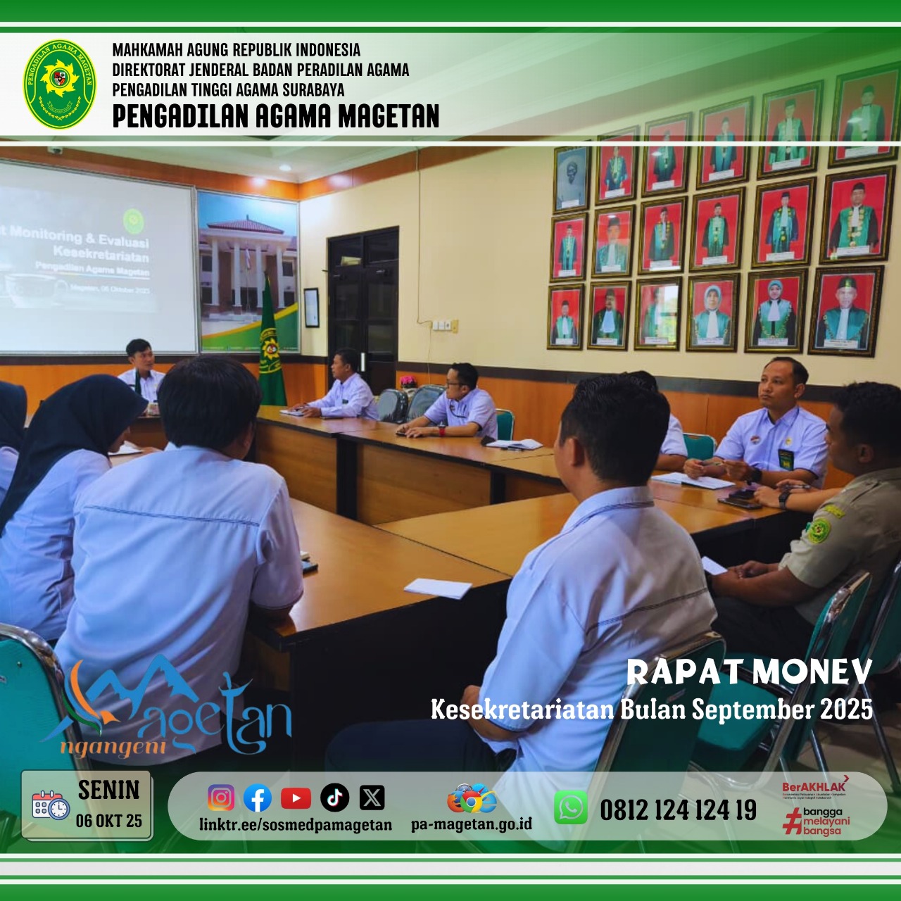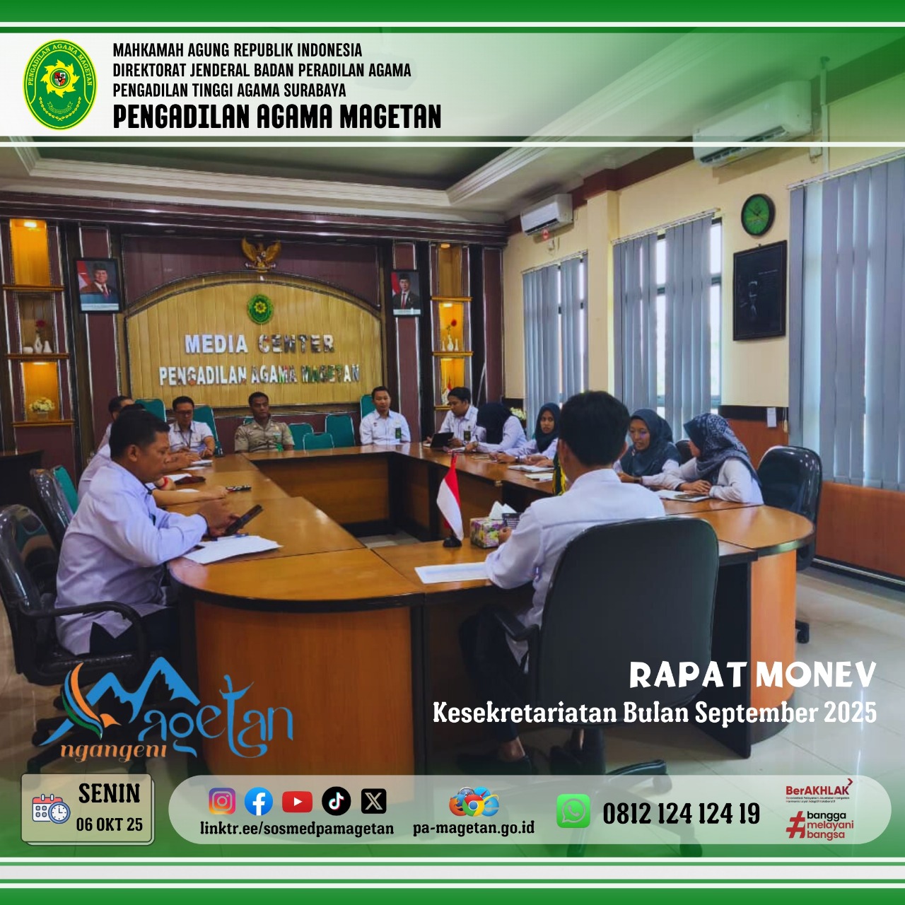Magetan, Senin 06 Oktober 2025 - Bertempat di Media Center Pengadilan Agama Magetan, telah dilaksanakan Rapat Monitoring dan Evaluasi (Monev) Kesekretariatan yang dipimpin oleh Bapak Onis Nur Islahi, S.Sos., M.M. selaku sekretaris Pengadilan Agama Magetan.
