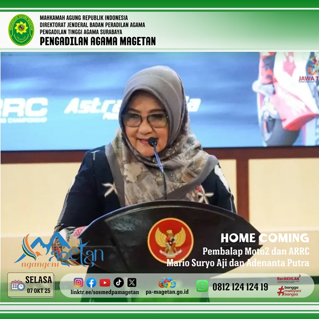 Magetan, 7 Oktober 2025 – Pemerintah Kabupaten Magetan menggelar acara Home Coming Pembalap Moto2 Mario Aji dan Adenanta Putra pada Selasa (7/10/2025) bertempat di Ruang Jamuan Pendopo Surya Graha Magetan. Kegiatan ini menjadi ajang audiensi dan silaturahmi antara Pemerintah Kabupaten Magetan dengan dua pembalap muda berbakat asal Indonesia, sekaligus bentuk kebanggaan dan apresiasi terhadap prestasi putra daerah yang telah mengharumkan nama bangsa di kancah internasional. Acara tersebut dihadiri oleh Bupati Magetan Hj. Nanik Endang Rusminiarti, M.Pd, bersama jajaran Forkopimda Kabupaten Magetan. Dari Pengadilan Agama Magetan, hadir Sekretaris Pengadilan Agama Magetan, Onis Nur Islahi, S.Sos., M.M. sebagai perwakilan lembaga.