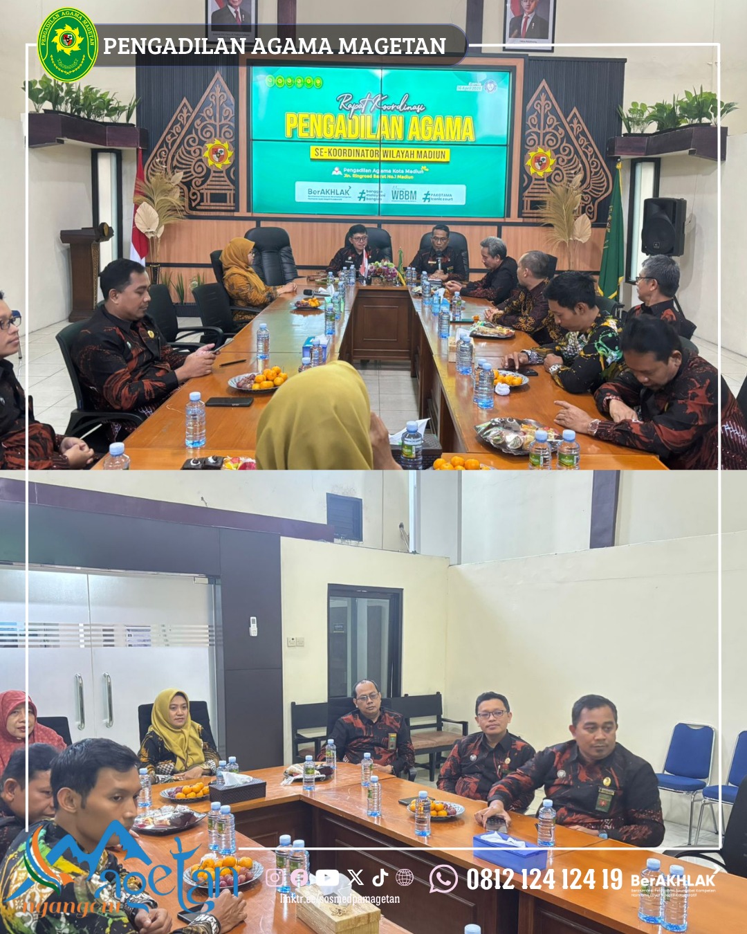 Pengadilan Agama Magetan mengikuti rapat koordinasi (rakor) wilayah Madiun pada Jumat, 17 April 2026. Kegiatan ini dilaksanakan di Pengadilan Agama Kota dan diikuti oleh para Ketua, Panitera, serta Sekretaris dari satuan kerja Pengadilan Agama se-karesidenan Madiun. Dari PA Magetan, hadir Ketua Dr. Hermin Sriwulan, S.H.I., S.H., M.H.I., Panitera Hj. Nilna Niamatin, S.Ag., M.H., dan Sekretaris Onis Nur Islahi, S.Sos., M.M. Rakor ini bertujuan memperkuat koordinasi dan sinergi antar satuan kerja.