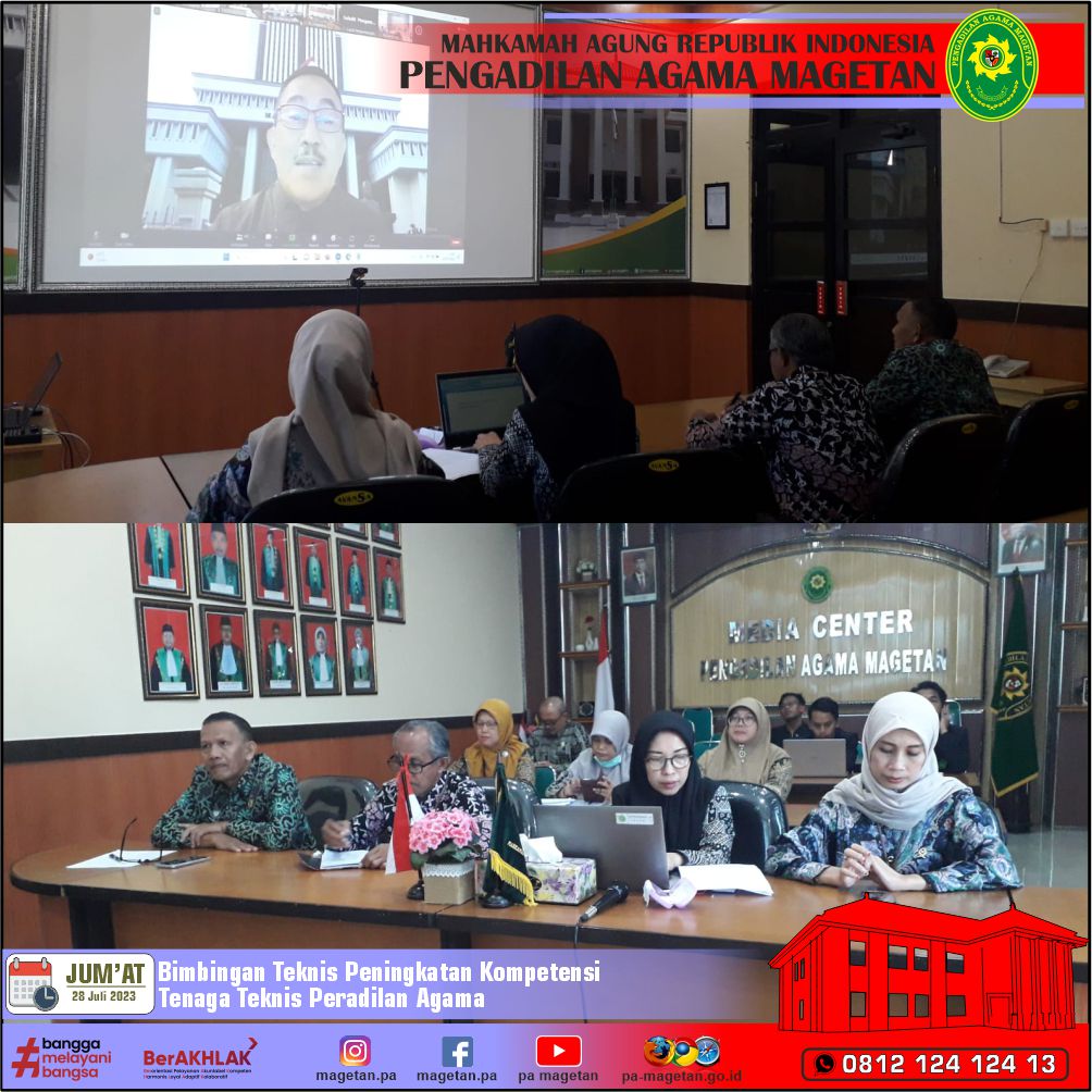 Magetan | pa-magetan.go.id | Pengadilan Agama Magetan diwakili oleh Ketua, Wakil Ketua, Para Hakim, Para Panmud dan Para Panitera Pengganti mengikuti Bimbingan Teknis Peningkatan Tenaga Teknis Dilingkungan Peradilan Agama secara online dari Media Center Pengadilan Agama Magetan.
