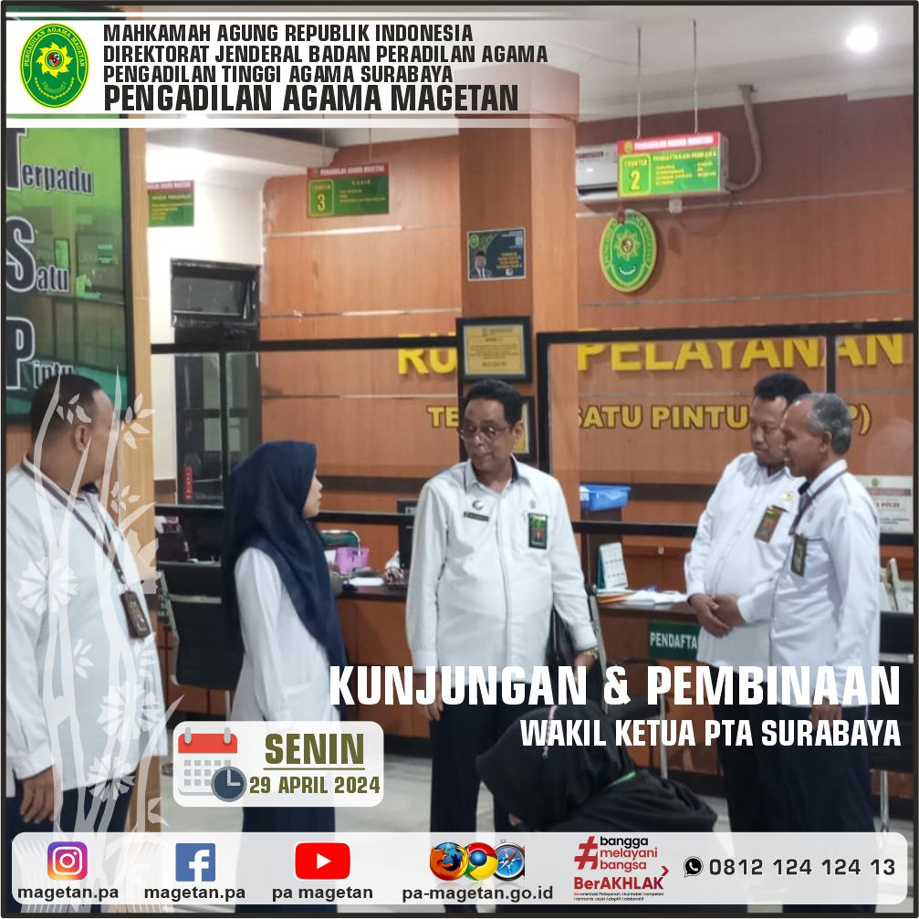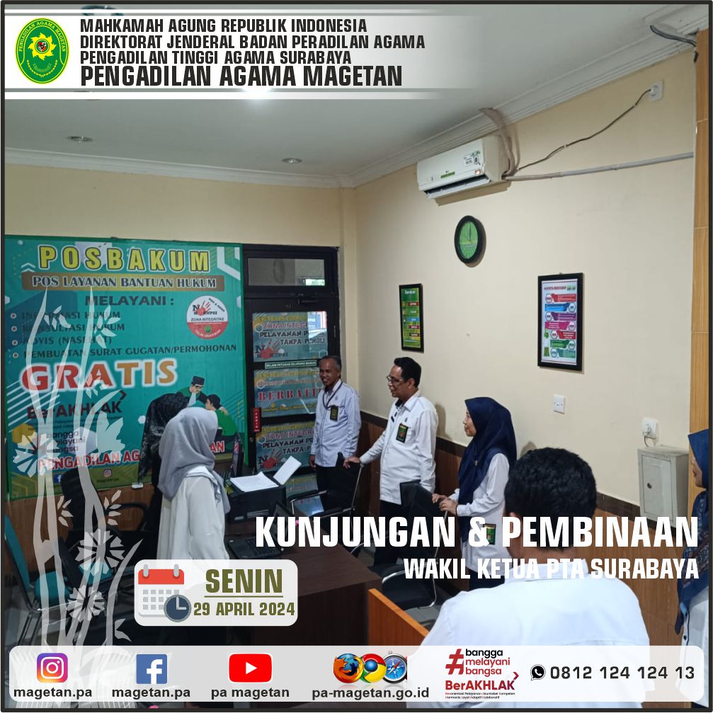 Dalam kunjungannya Wakil Ketua Pengadilan Tinggi Agama Surabaya langsung memonitoring pelaksanaan pelayanan kepada para pencari keadilan di Pelayanan Terpadu Satu Pintu dan Ruang tunggu persidangan. Beliau mengapresiasi dengan baik atas proses pelayanan kepada para pencari keadilan di Pengadilan Agama Magetan. Kelengkapan sarana dan prasarana yang disediakan kepada para pencari keadilan jugu memperoleh penilaian yang baik, mulai dari ruang PTSP, ruang tunggu sidang dan area bermain bagi anak-anak yang sangat baik dan bersih.