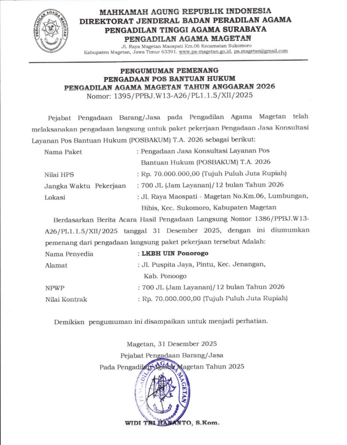 Berikut Lampiran Pengumuman Pemenang Pengadaan Pos Bantuan Hukum Pengadilan Agama Magetan TA 2026