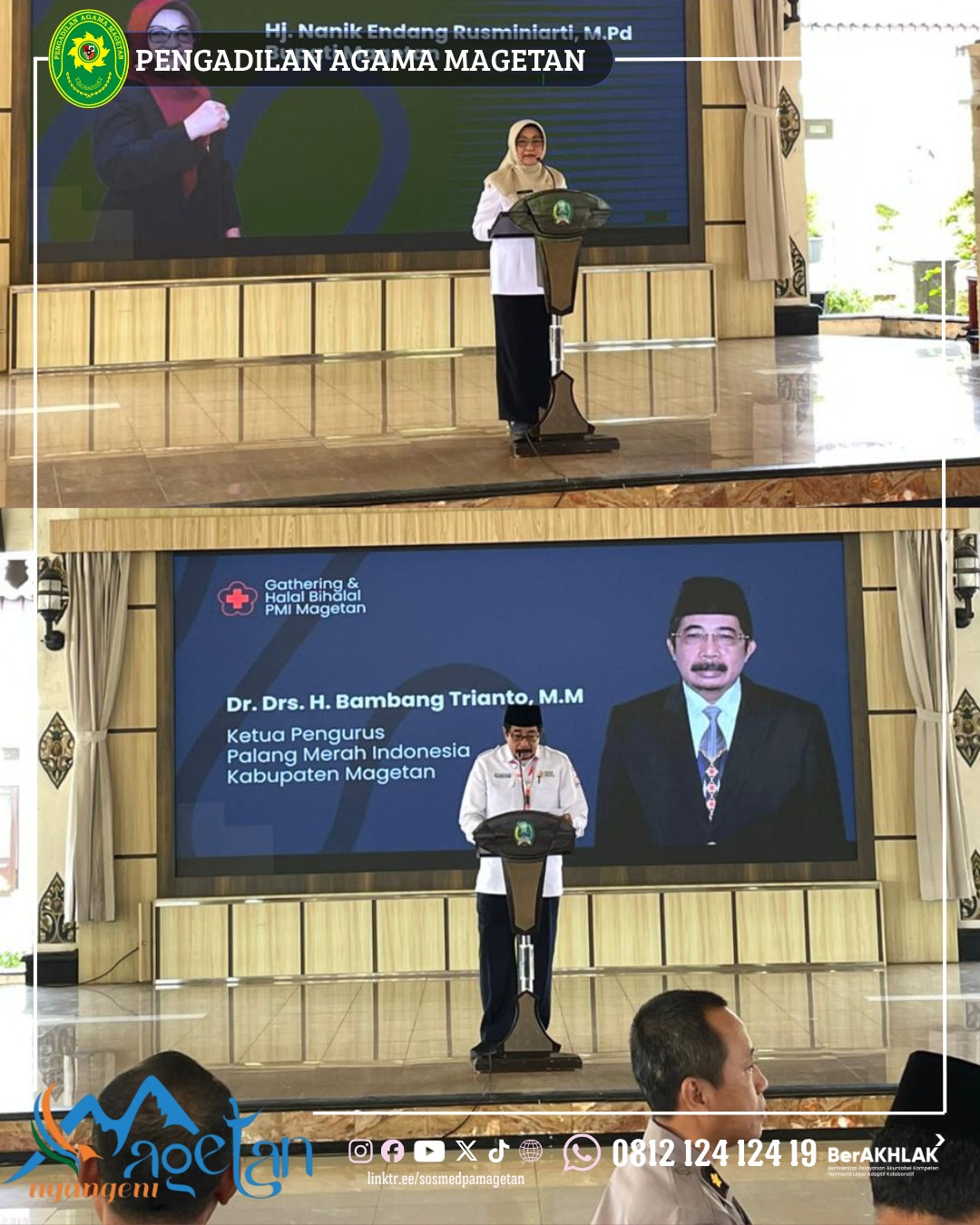 Pengadilan Agama Magetan menghadiri kegiatan Gathering dan Halal Bihalal yang diselenggarakan oleh Palang Merah Indonesia Kabupaten Magetan pada Rabu, 15 April 2026. Kegiatan ini berlangsung di Pendapa Surya Graha dan diikuti oleh berbagai unsur Forkopimda, pimpinan instansi, serta relawan PMI. Dari PA Magetan, hadir Wakil Ketua Huda Lukoni, S.H.I., S.H., M.H. Kehadiran ini menjadi bentuk dukungan terhadap kegiatan sosial kemanusiaan di Kabupaten Magetan.